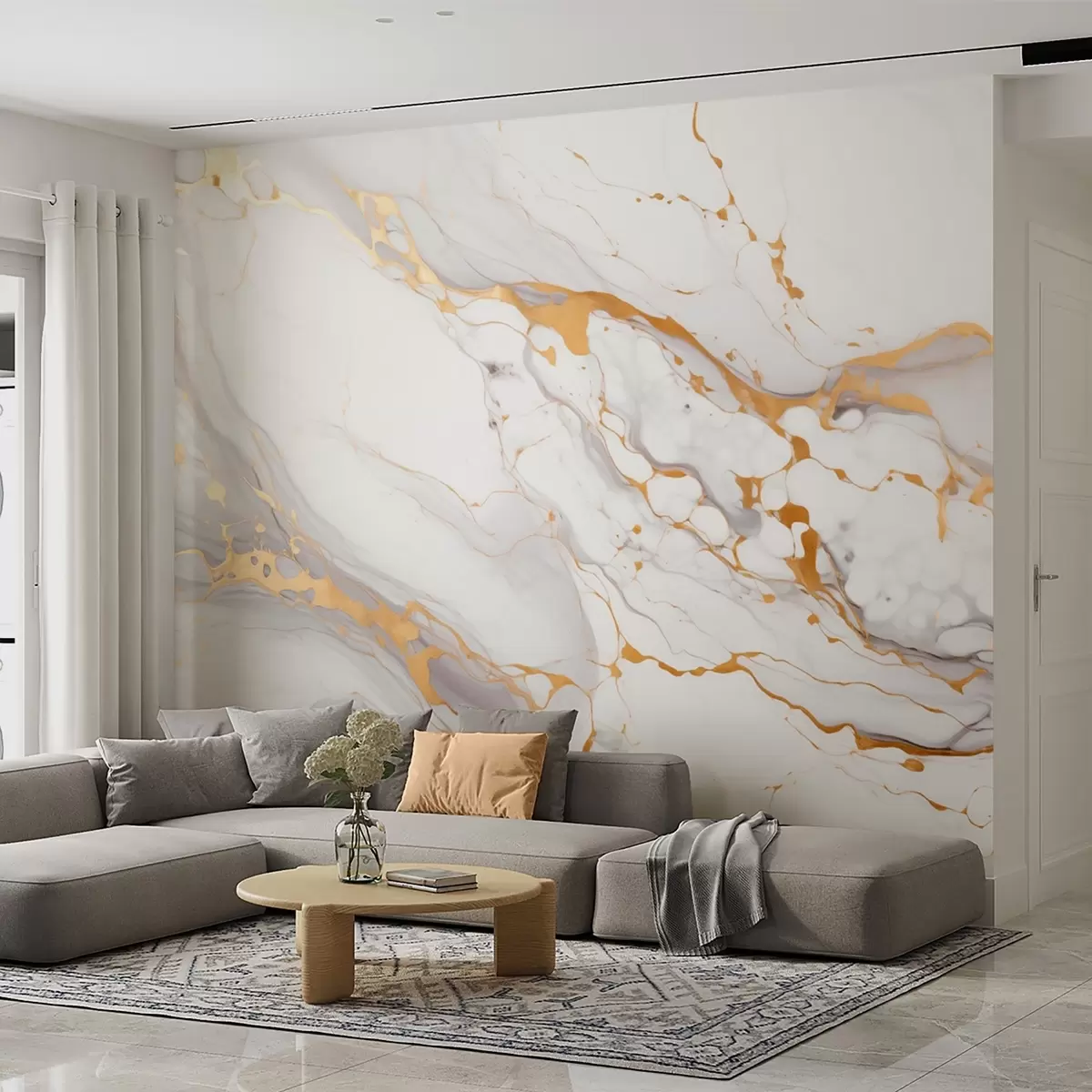 Papel tapiz Imitación de textura de mármol con suaves transiciones grises y acentos amarillos Nr. w09362