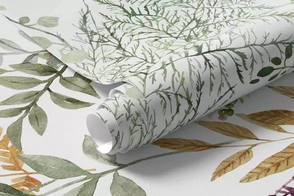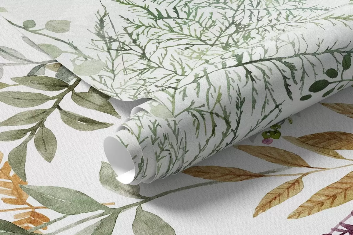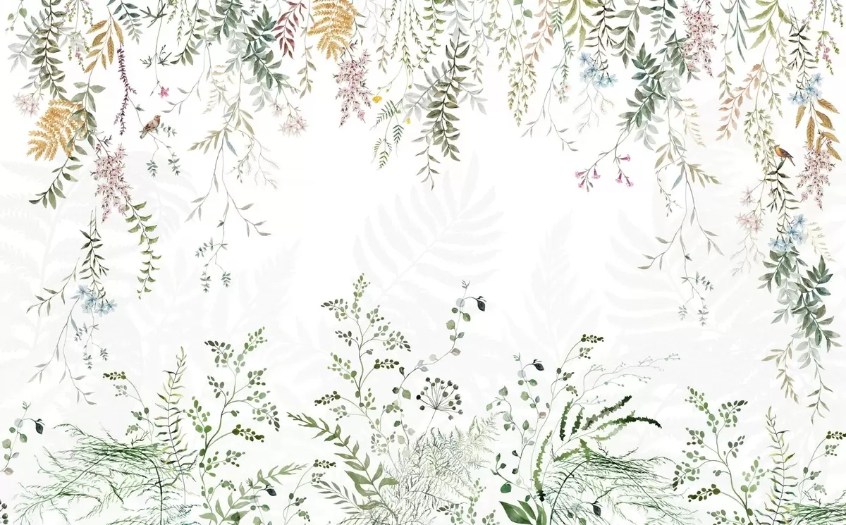 Papel tapiz Ilustración botánica con helechos, hierba y plantas colgantes, tonos pastel, sobre fondo blanco estilo acuarela texturizada Nr. w09364