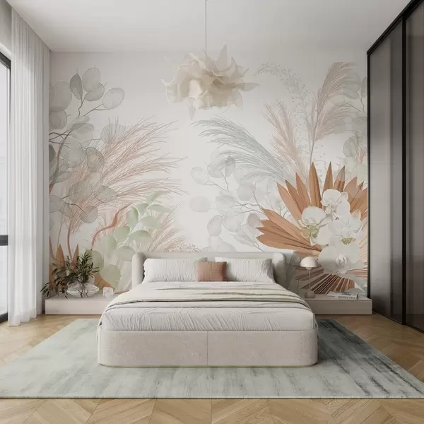 Papel tapiz Hierba de la pampa, eucalipto, hojas tropicales y orquídeas sobre fondo blanco, colores pastel. Nr. w09366