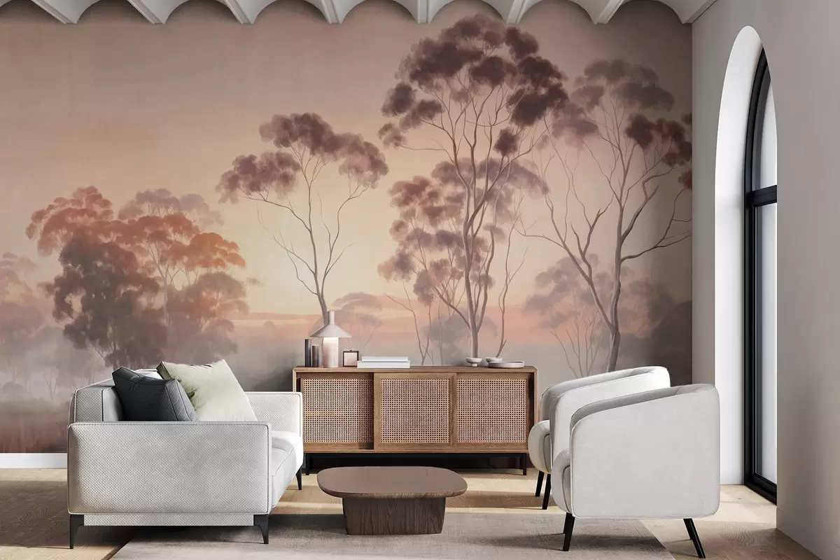 Papel tapiz Un paisaje con eucaliptos en un campo con cielo rosa pastel y naranja, una ligera niebla, pintura estilo texturizado Nr. w09367