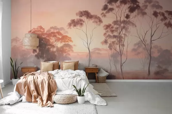Papel tapiz Un paisaje con eucaliptos en un campo con cielo rosa pastel y naranja, una ligera niebla, pintura estilo texturizado Nr. w09367