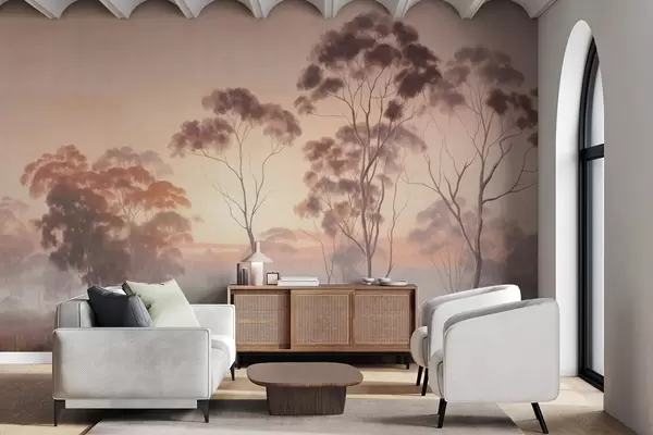 Papel tapiz Un paisaje con eucaliptos en un campo con cielo rosa pastel y naranja, una ligera niebla, pintura estilo texturizado Nr. w09367