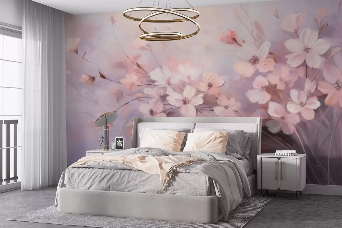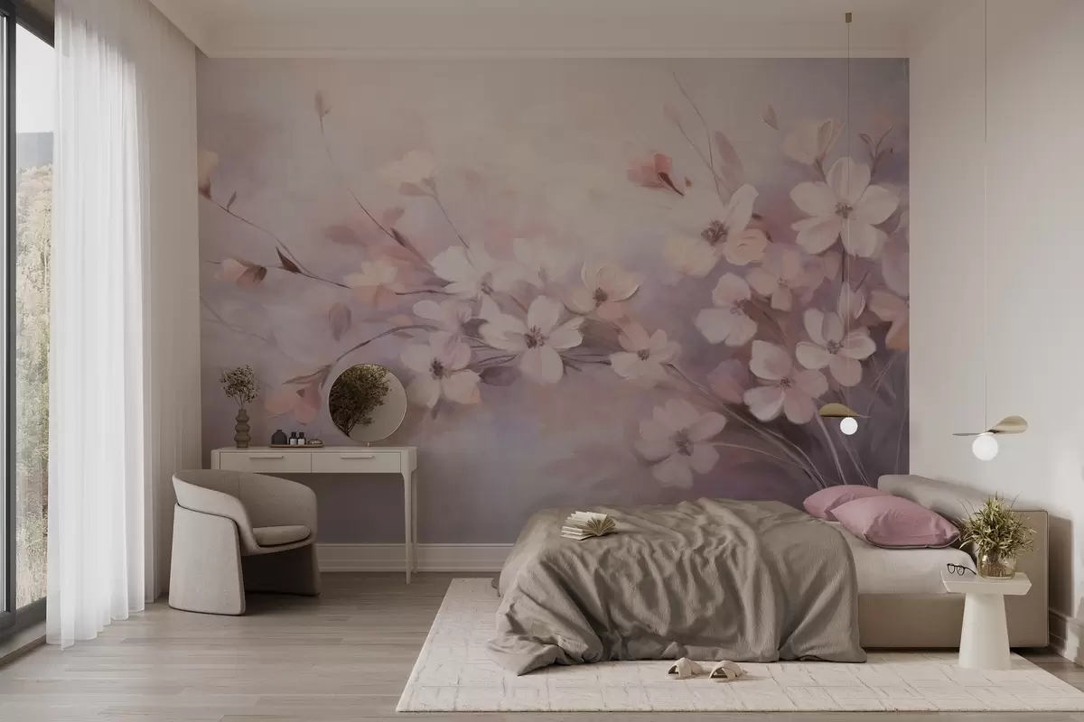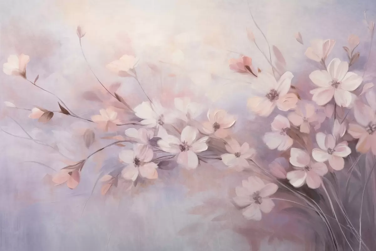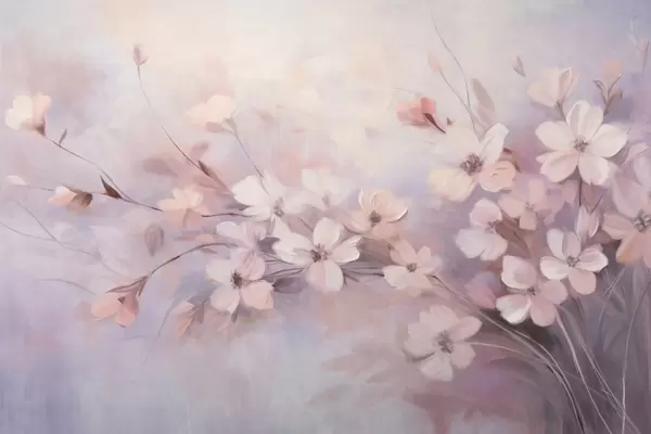 Papel tapiz Un arreglo floral con delicadas flores de bordes suaves y difuminados, sobre un fondo pastel de tonos lavanda y rosa claro Nr. w09369