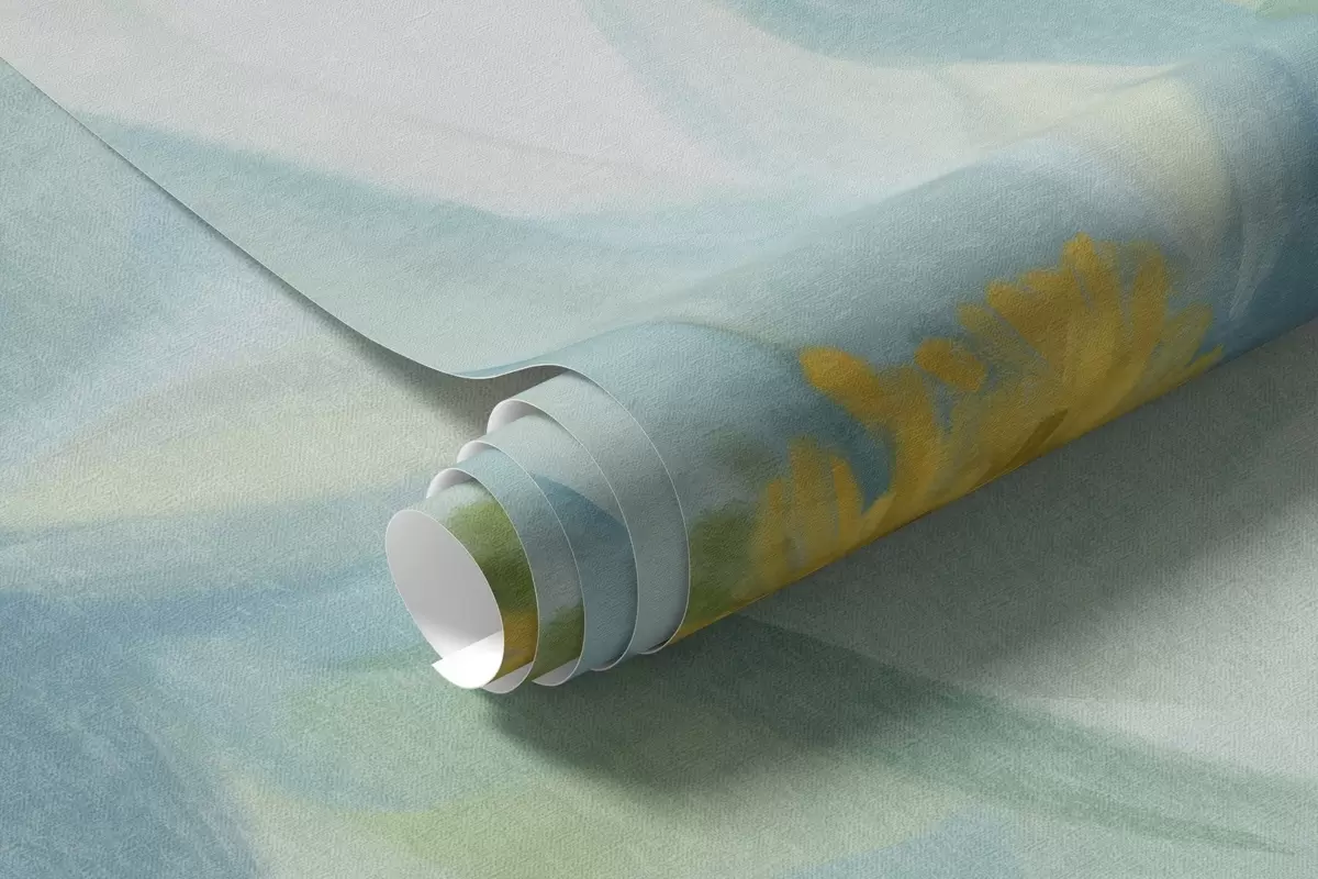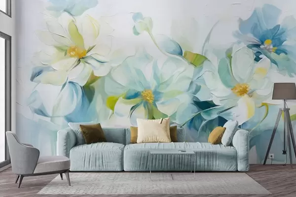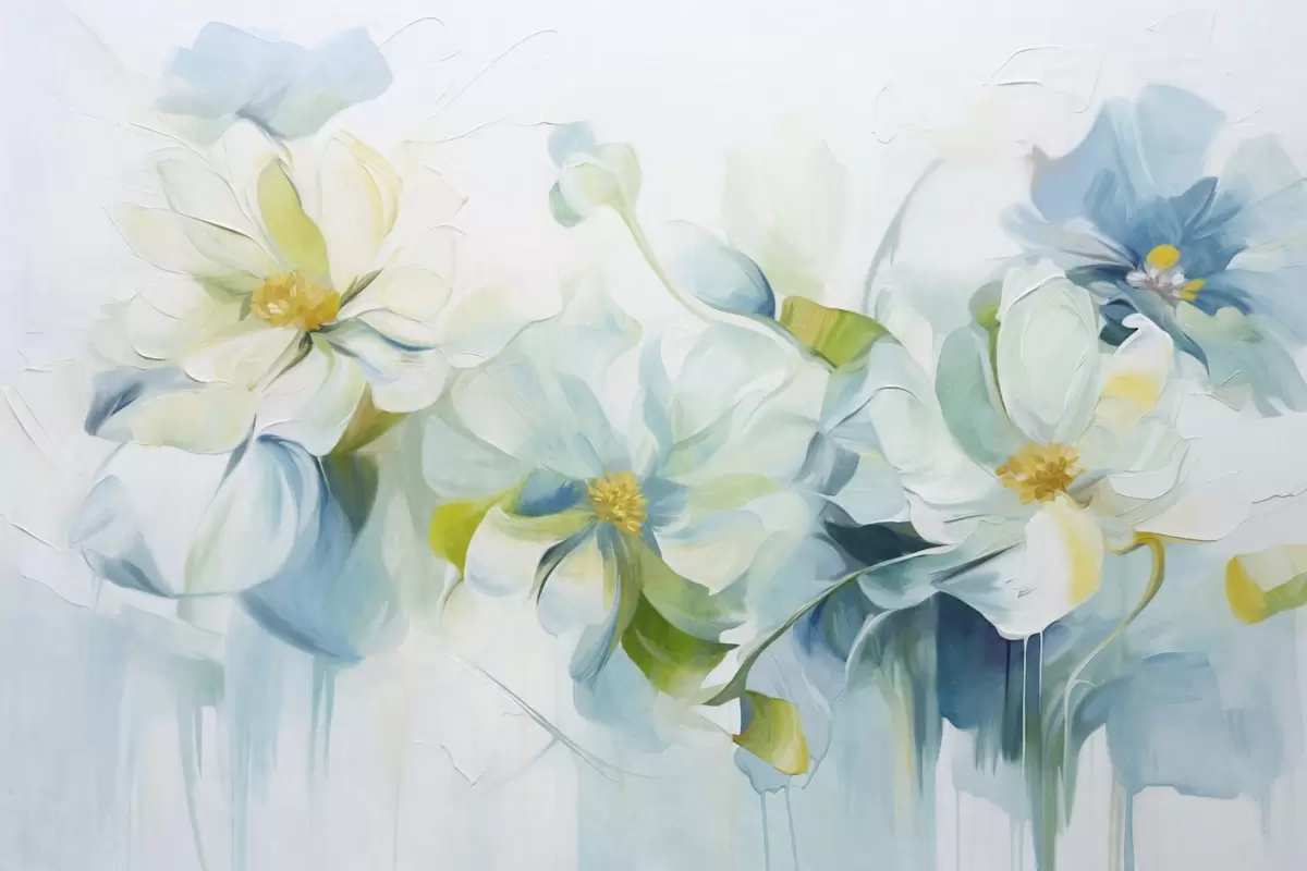 Papel tapiz Flores abstractas blancas y azules con pistilos amarillos y hojas verdes, en un fondo blanco, estilo de pintura texturizada Nr. w09372