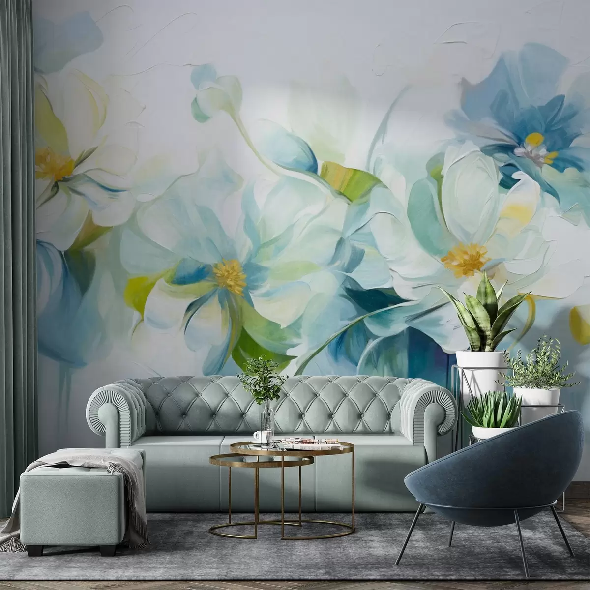 Papel tapiz Flores abstractas blancas y azules con pistilos amarillos y hojas verdes, en un fondo blanco, estilo de pintura texturizada Nr. w09372