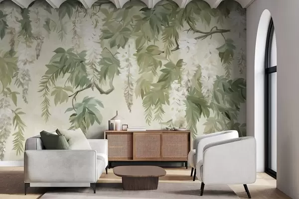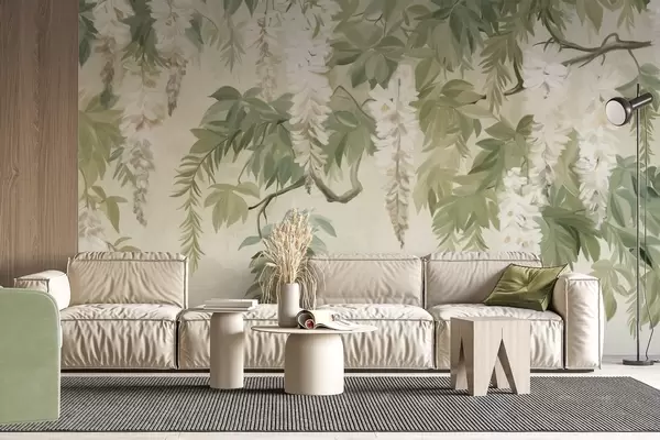 Papel tapiz Ramas de glicinas con flores blancas y hojas verdes, fondo verde, estilo de pintura vintage con textura Nr. w09375