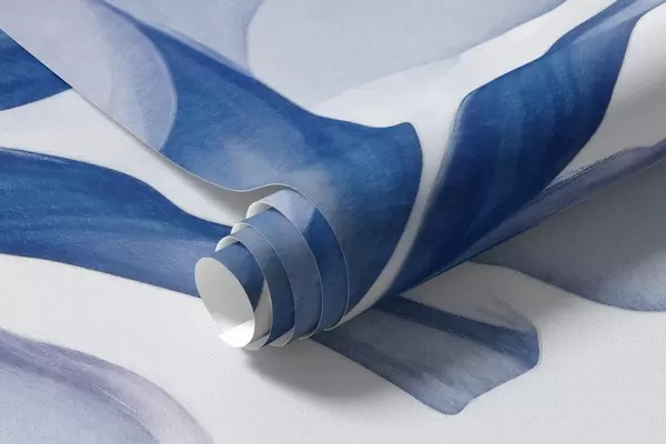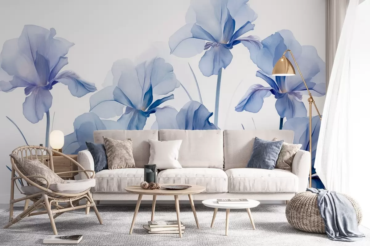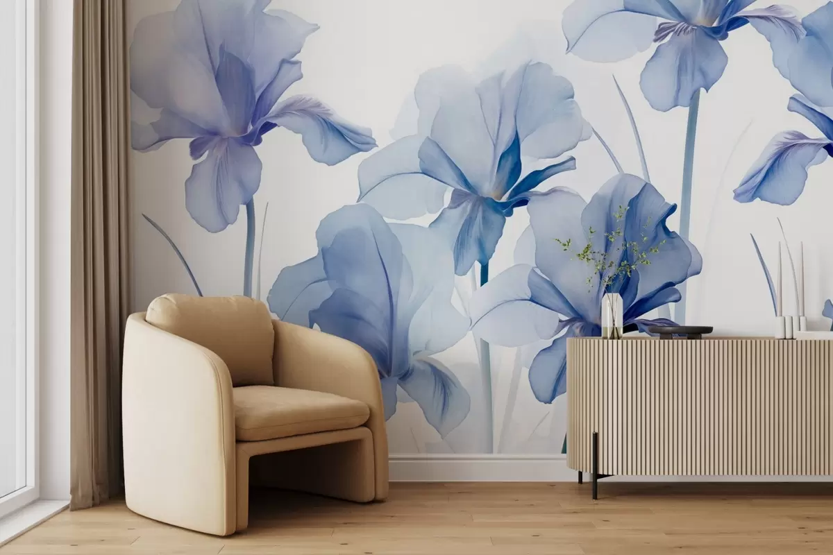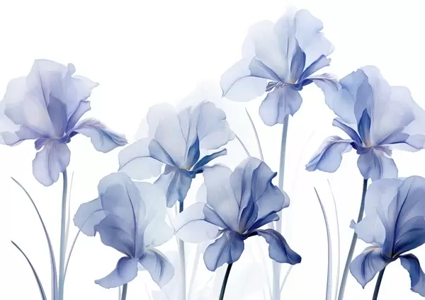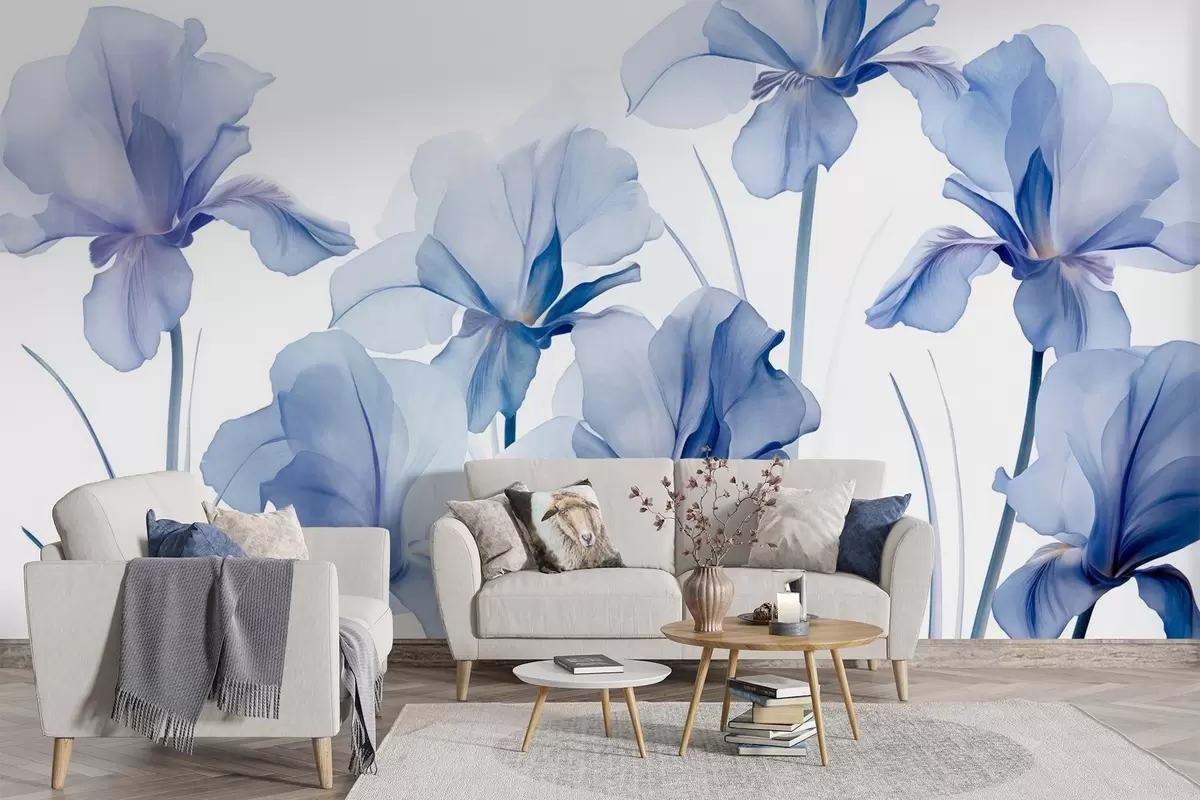 Papel tapiz Flores de iris azules con pétalos translúcidos y tallos largos, dispuestas en fila sobre un fondo azul, suave y texturizado Nr. w09379