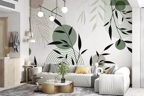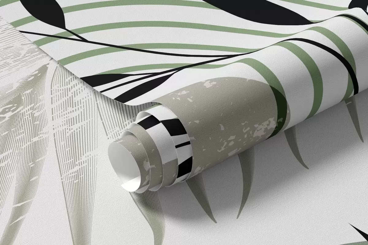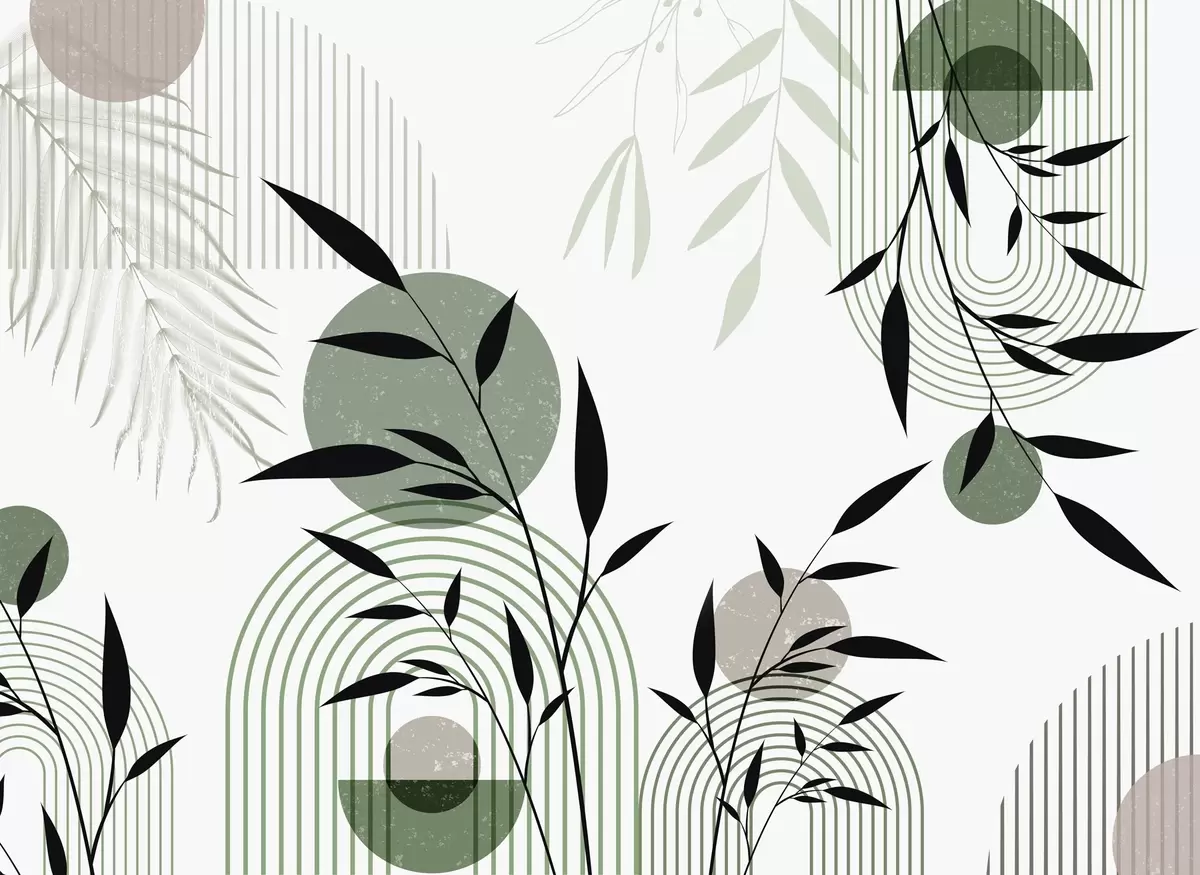 Papel tapiz Estampado abstracto texturizado con formas geométricas, círculos y arcos y plantas negras y verdes sobre fondo blanco Nr. w09384