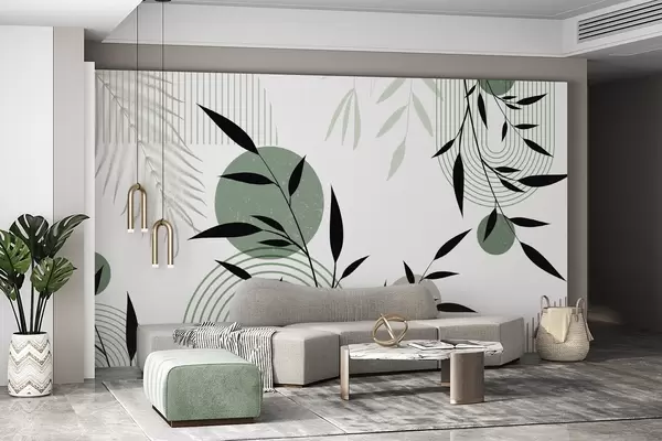 Papel tapiz Estampado abstracto texturizado con formas geométricas, círculos y arcos y plantas negras y verdes sobre fondo blanco Nr. w09384