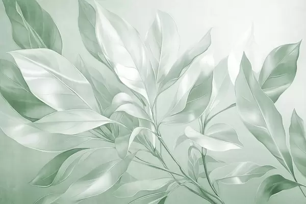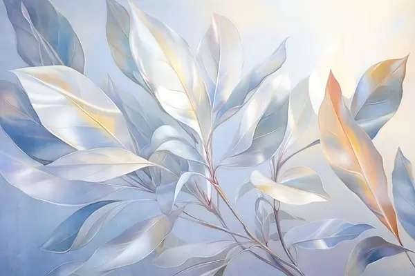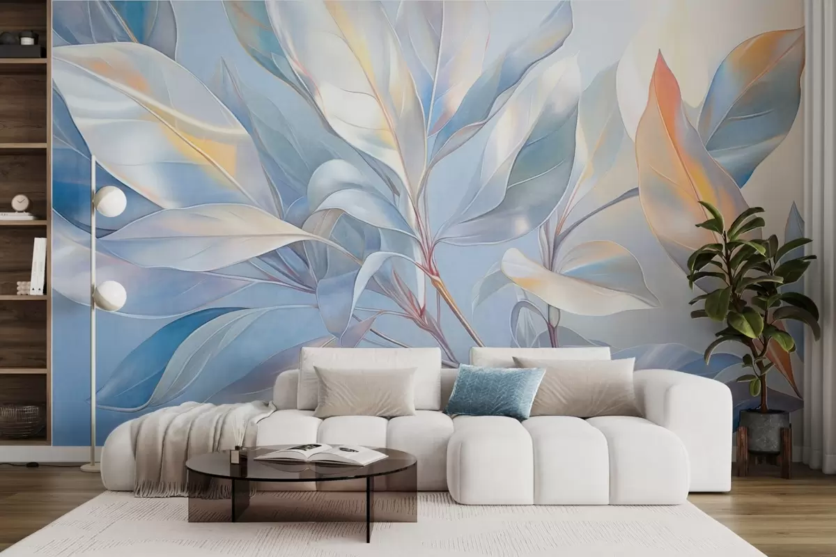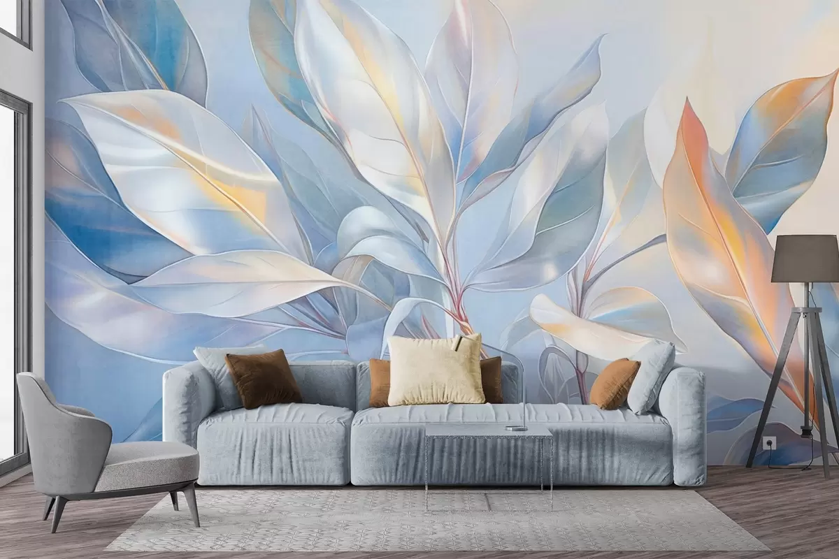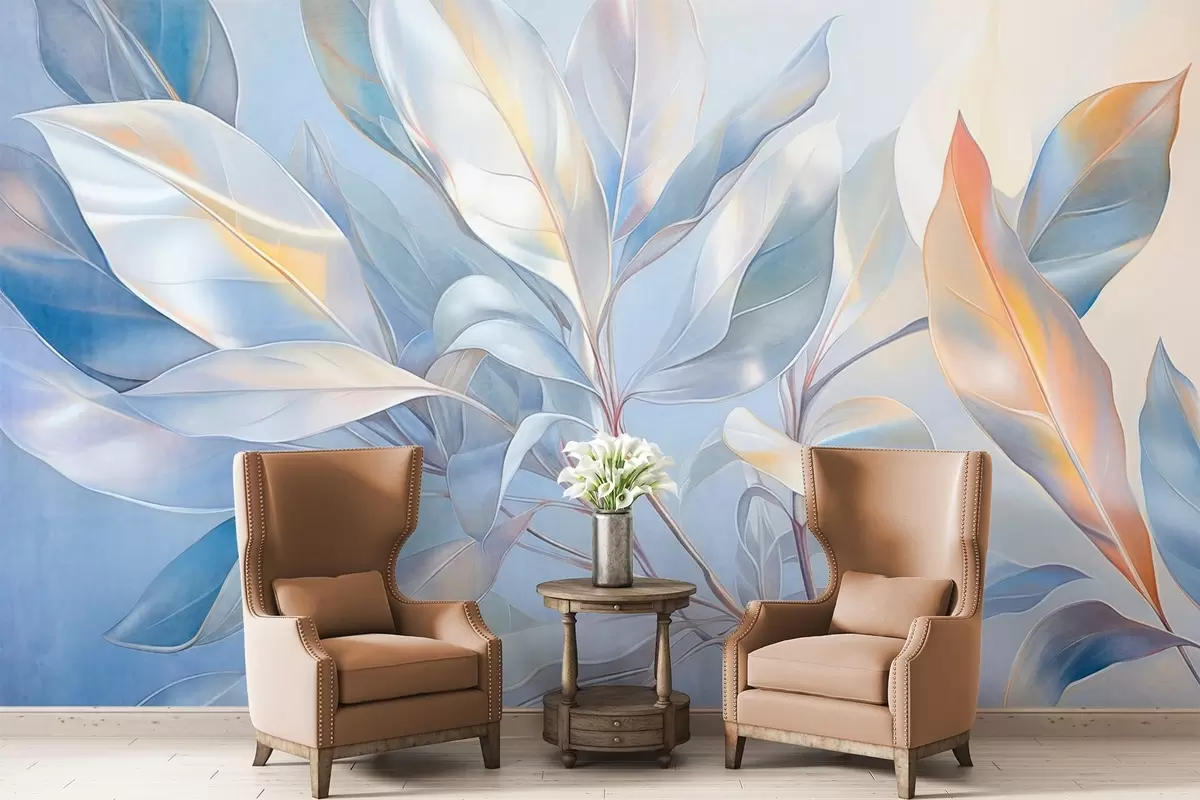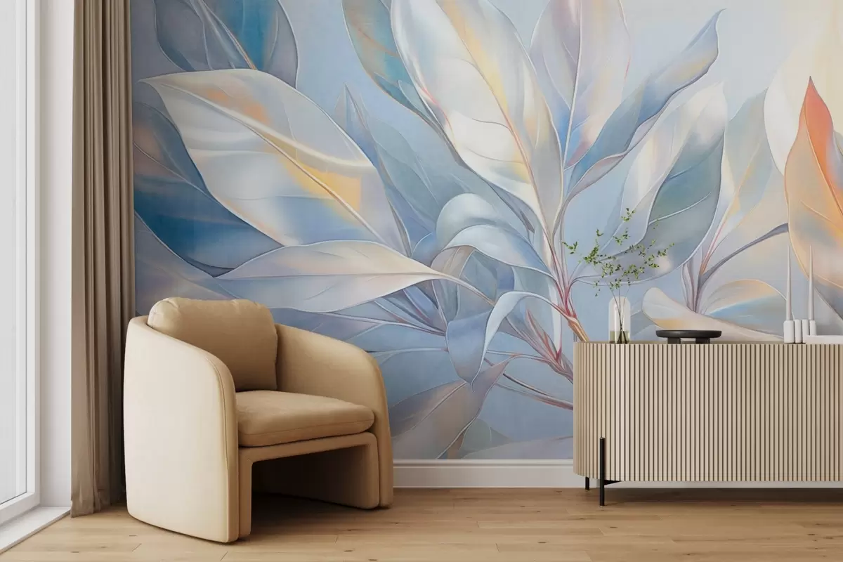 Papel tapiz Hojas de magnolia con tonos blancos y azules, iluminación suave, composición elegante, venas de las hojas detalladas, pinceladas artísticas Nr. w09385