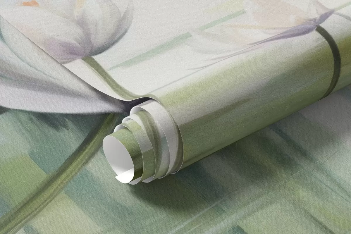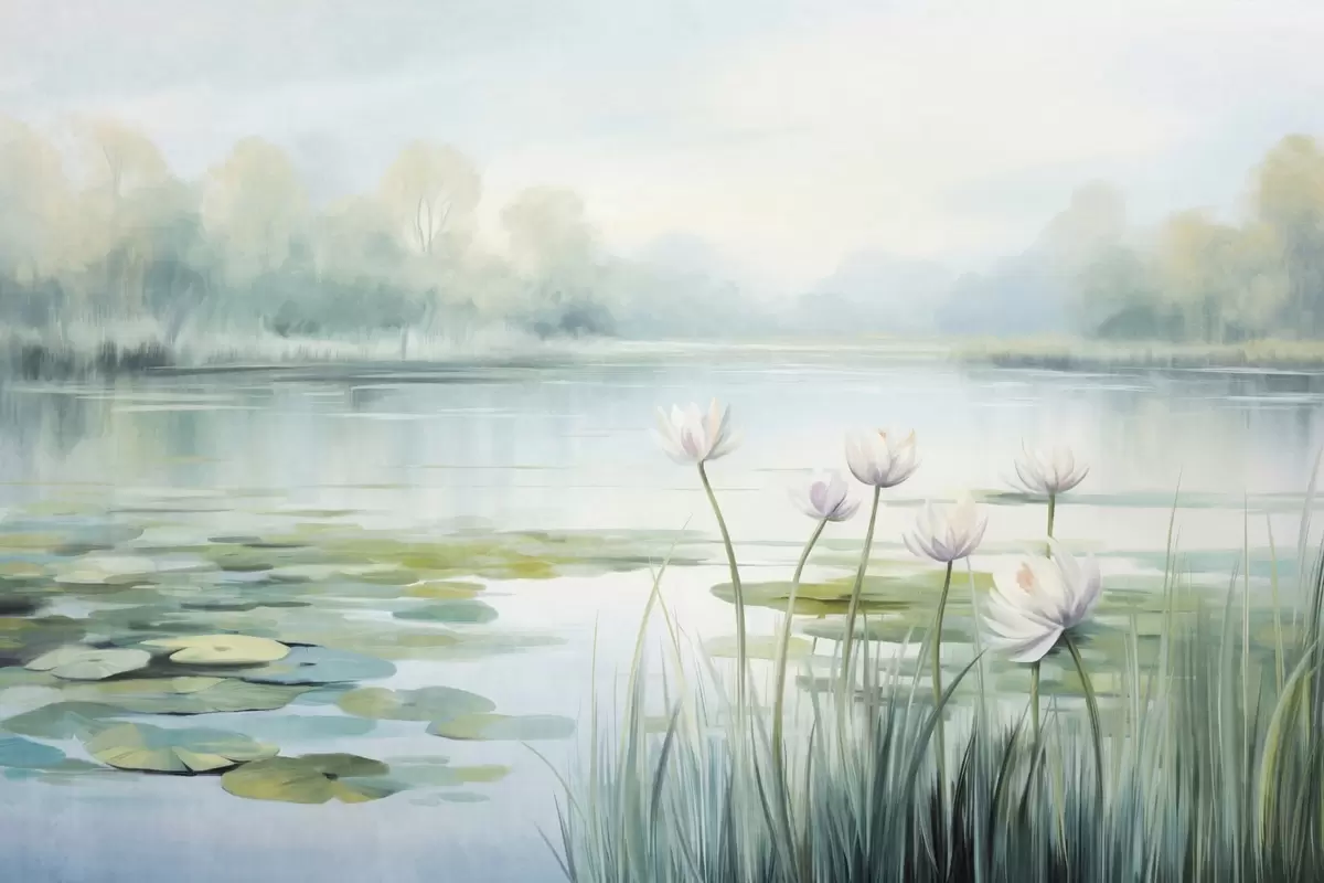 Papel tapiz Paisaje con un lago, nenúfares y hojas de nenúfar, árboles al fondo, en un entorno tranquilo, tonos azul claro y verde Nr. w09395