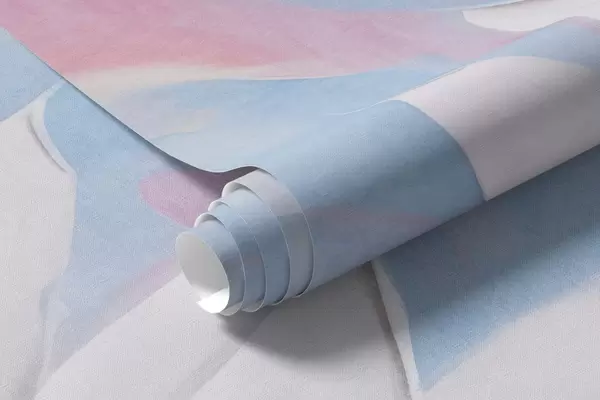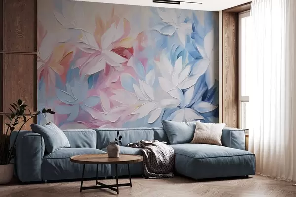 Papel tapiz Flores blancas con textura y hojas rosas y azules, pintura al óleo de estilo abstracto, pinceladas suaves, colores pastel Nr. w09396