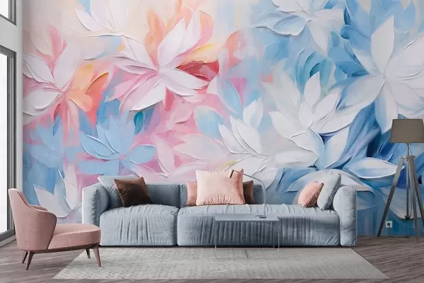 Papel tapiz Flores blancas con textura y hojas rosas y azules, pintura al óleo de estilo abstracto, pinceladas suaves, colores pastel Nr. w09396