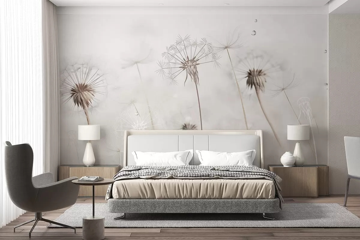 Papel tapiz Dientes de león con gotas de agua, fondo blanco, primer plano, luz suave, naturaleza, botánico, etéreo, delicado, minimalista Nr. w09399