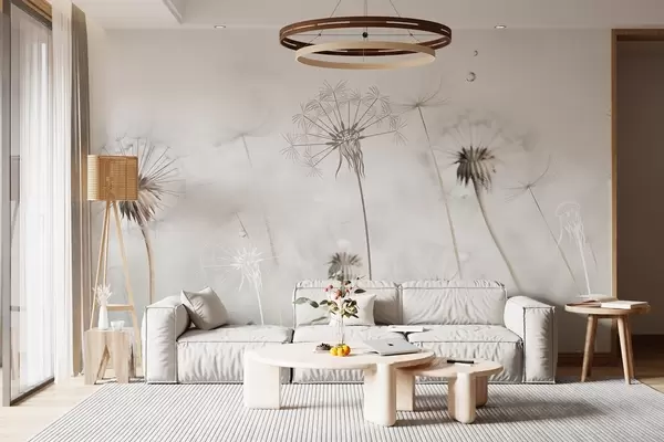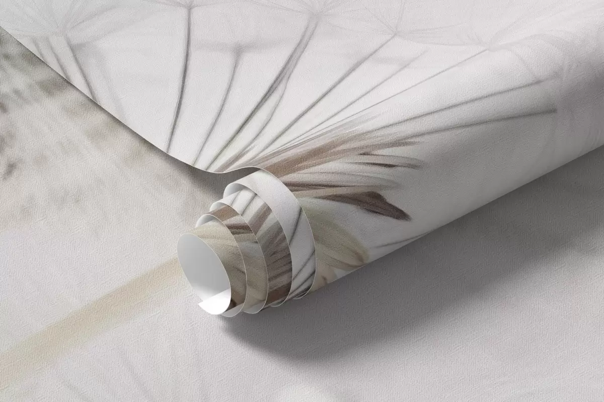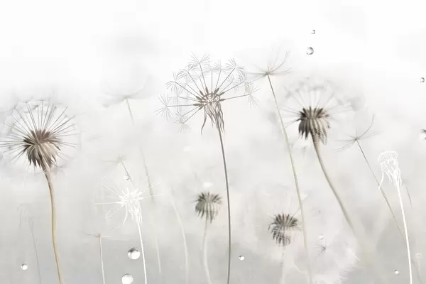 Papel tapiz Dientes de león con gotas de agua, fondo blanco, primer plano, luz suave, naturaleza, botánico, etéreo, delicado, minimalista Nr. w09399