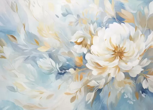 Papel tapiz Flor blanca texturizada con detalles azules y amarillos y hojas sobre un fondo abstracto azul y blanco, estilo pictórico Nr. w09403