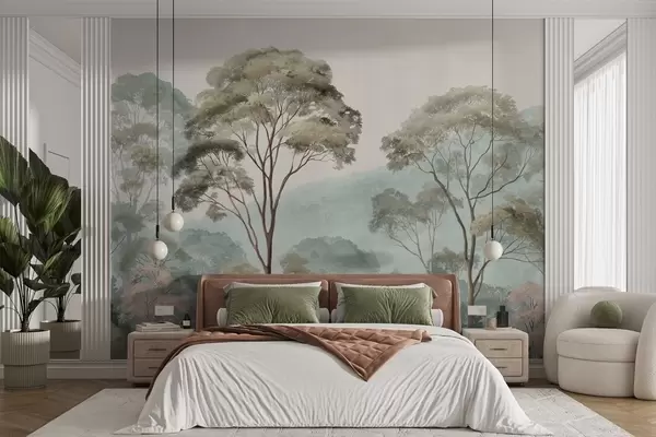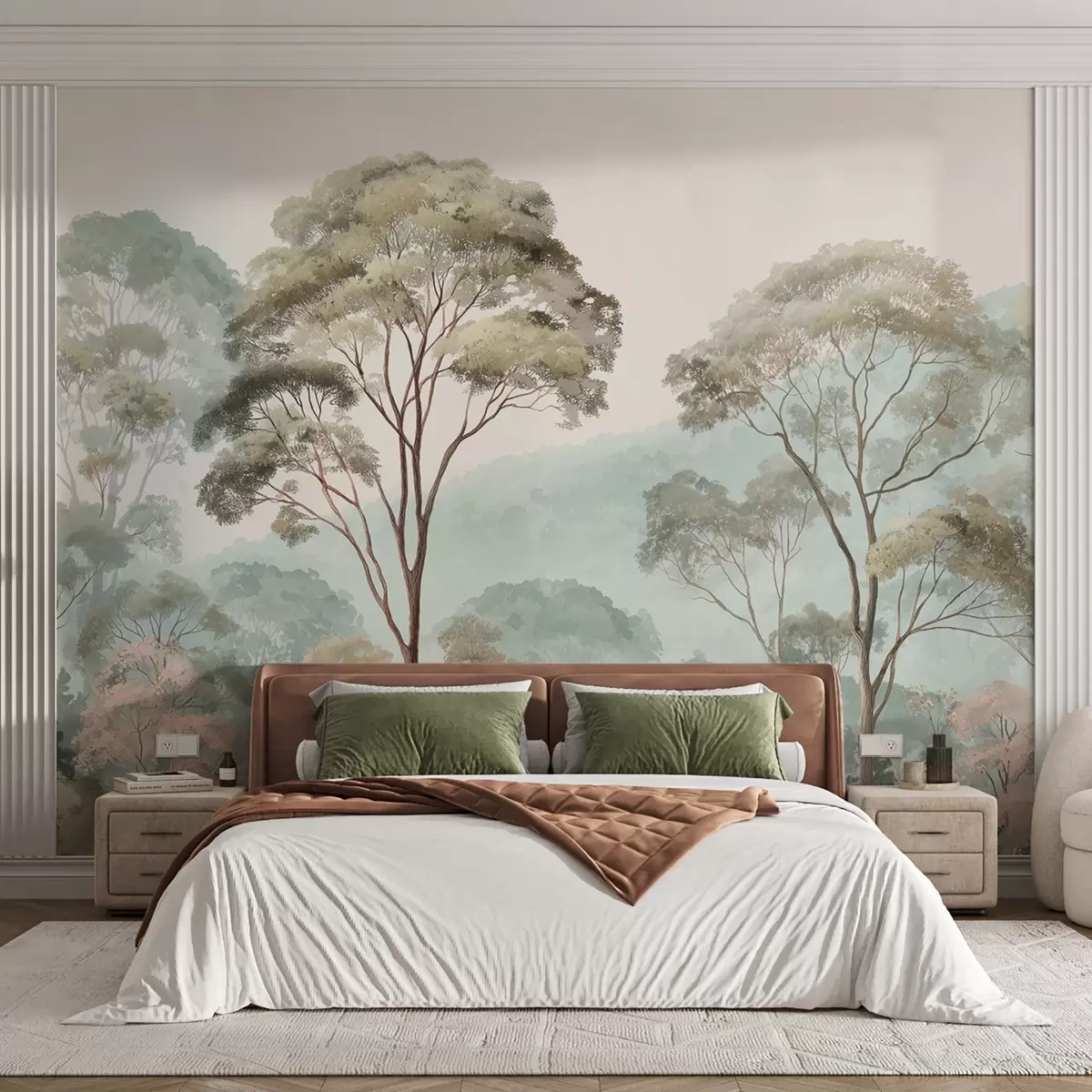 murales de pared Mañana brumosa en el bosque en estilo acuarela w09405