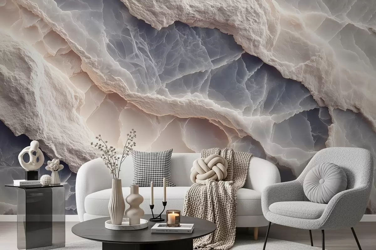 Papel tapiz Elegante abstracción al estilo de capas de mármol y minerales en color azul-beige Nr. w09408