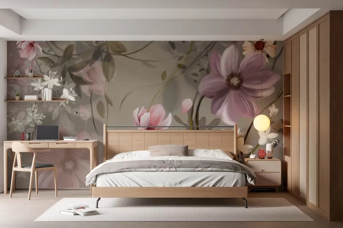 Papel tapiz Flores rosas y blancas con tallos y hojas marrones, iluminación suave, colores apagados, arreglo floral Nr. w09417