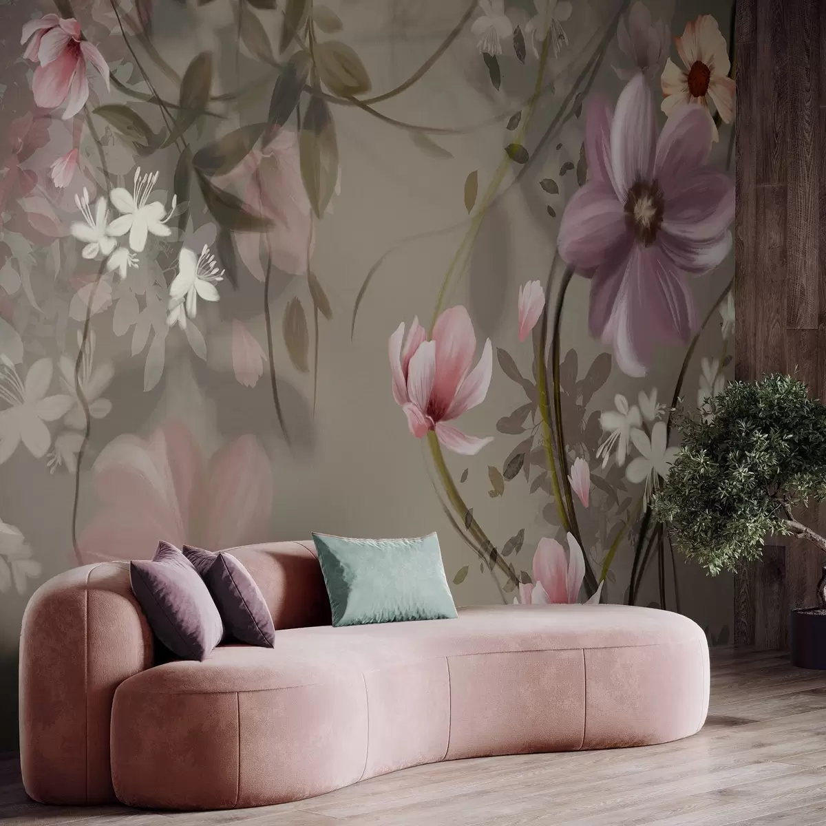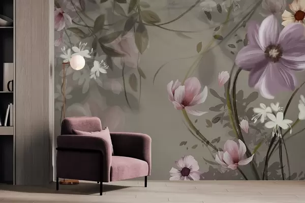 Papel tapiz Flores rosas y blancas con tallos y hojas marrones, iluminación suave, colores apagados, arreglo floral Nr. w09417