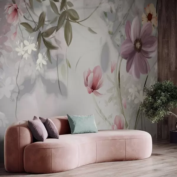 Papel tapiz Flores rosas y blancas con tallos y hojas verdes, iluminación suave, colores apagados, arreglo floral Nr. w09417v1