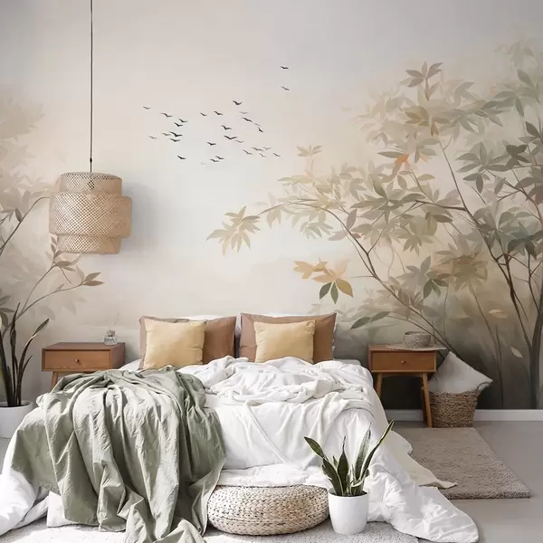 Papel tapiz Paisaje texturizado con árboles y una bandada de pájaros volando en el cielo, colores pastel, escena natural Nr. w09418