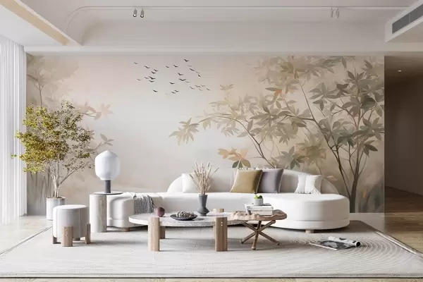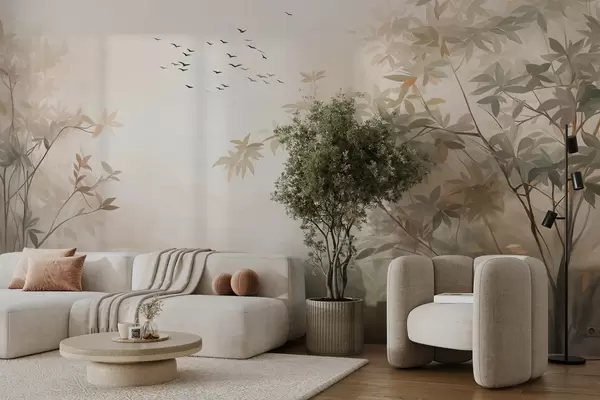 Papel tapiz Paisaje texturizado con árboles y una bandada de pájaros volando en el cielo, colores pastel, escena natural Nr. w09418