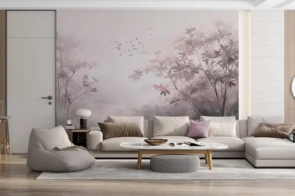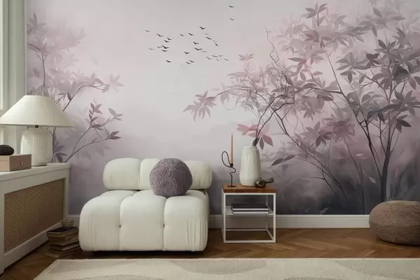 murales de pared Paisaje texturizado con árboles y una bandada de pájaros volando en el cielo, colores pastel, escena natural w09418v1