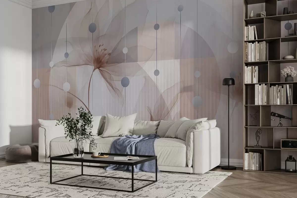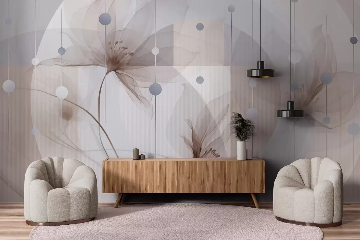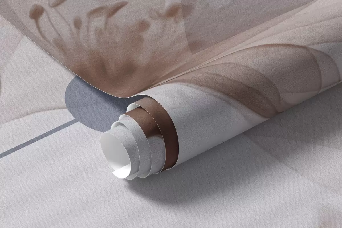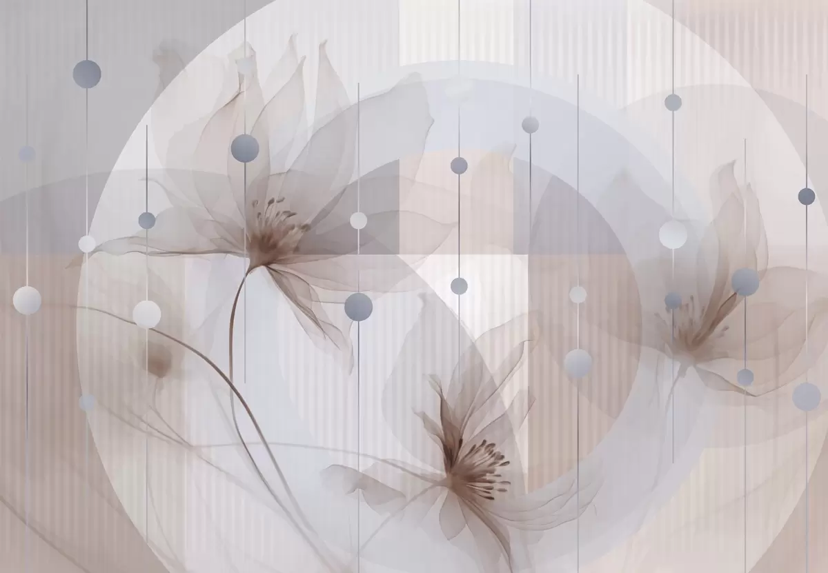 Papel tapiz Flores abstractas translúcidas, círculos y formas geométricas, paleta de colores azul pastel, marrón y blanco Nr. w09419v1