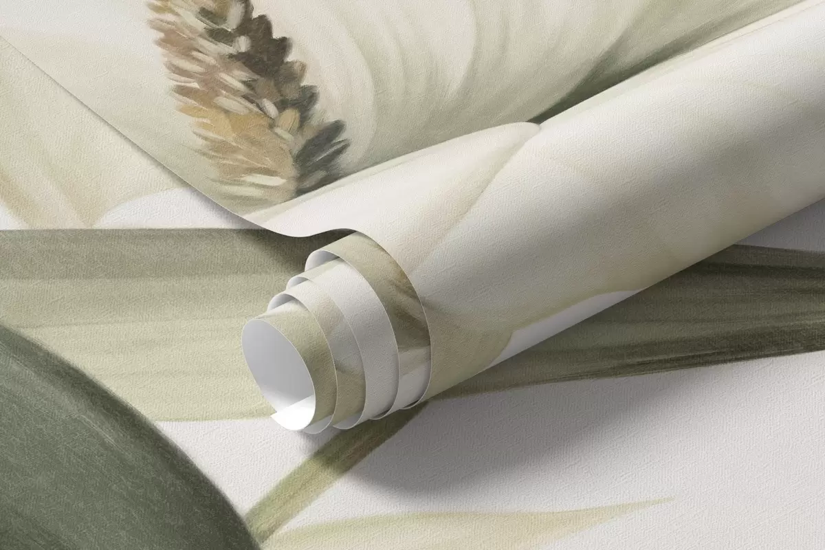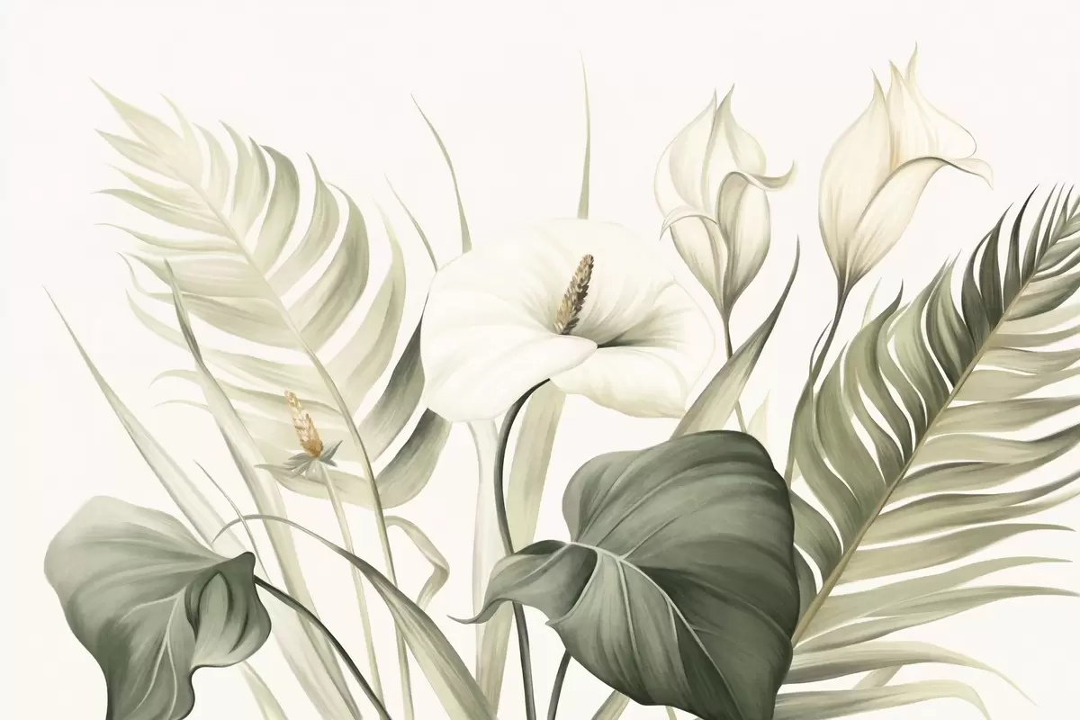 Papel tapiz Calas blancas y hojas tropicales verdes, ilustración botánica, fondo claro, estilo vintage, texturizado Nr. w09423