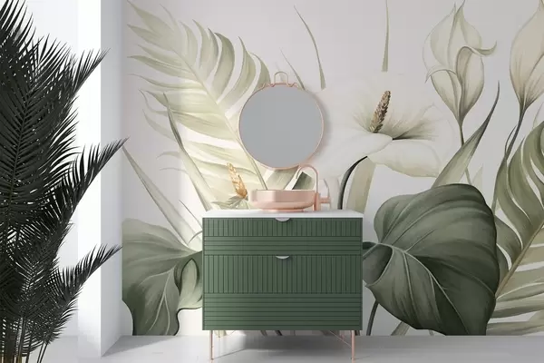 Papel tapiz Calas blancas y hojas tropicales verdes, ilustración botánica, fondo claro, estilo vintage, texturizado Nr. w09423