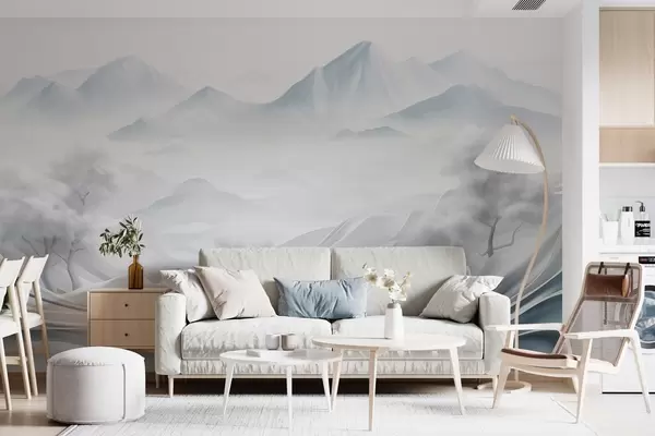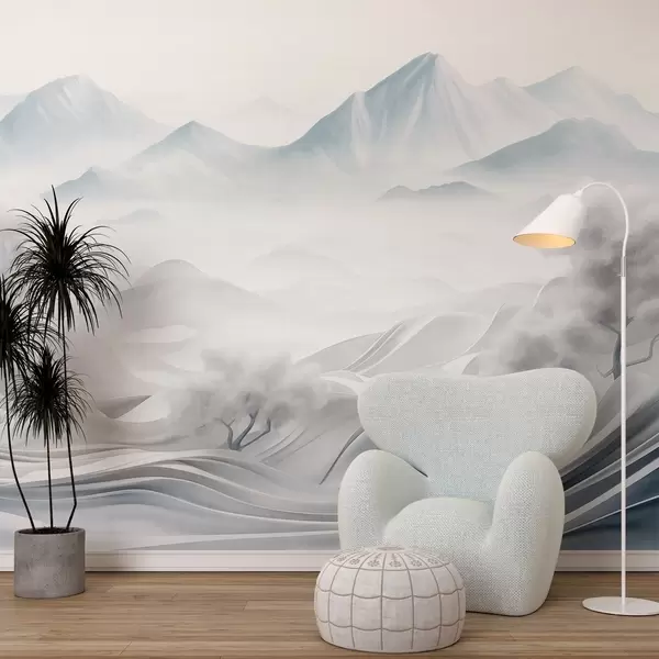 Papel tapiz Paisaje montañoso abstracto nevado con árboles blancos y niebla, estilo minimalista con textura Nr. w09426