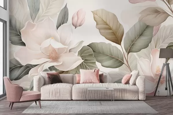 Papel tapiz Flores de magnolia con hojas en colores pastel, blanco, rosa y verde, suaves, delicadas, estilo acuarela Nr. w09427