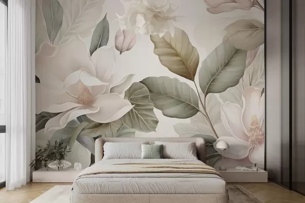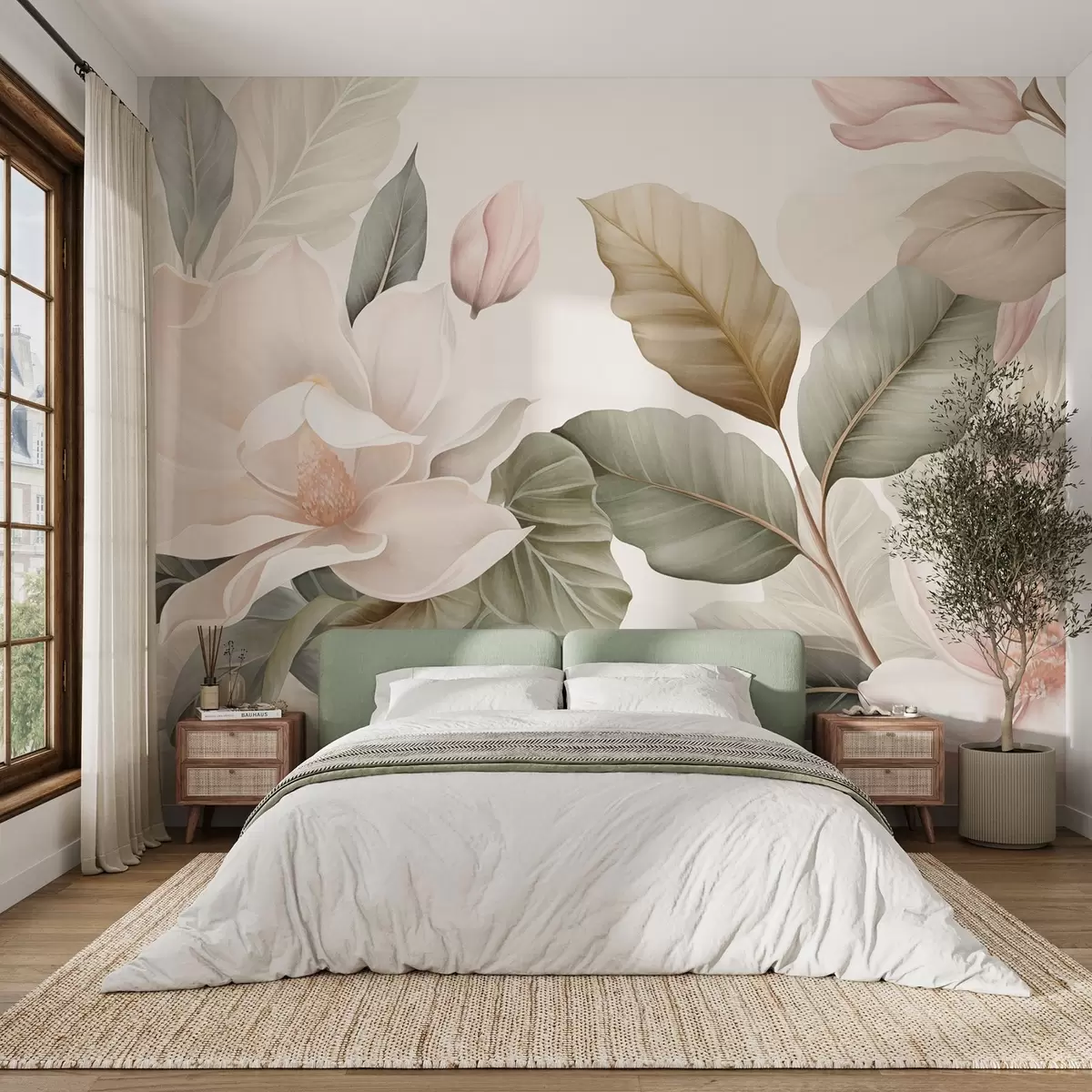 Papel tapiz Flores de magnolia con hojas en colores pastel, blanco, rosa y verde, suaves, delicadas, estilo acuarela Nr. w09427