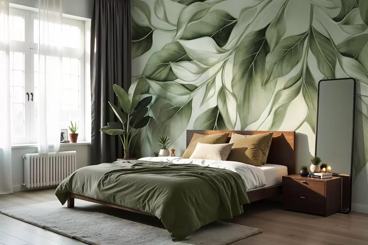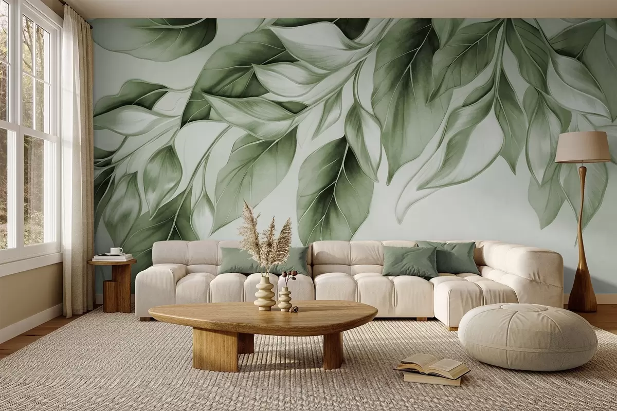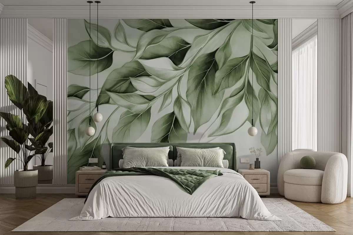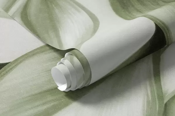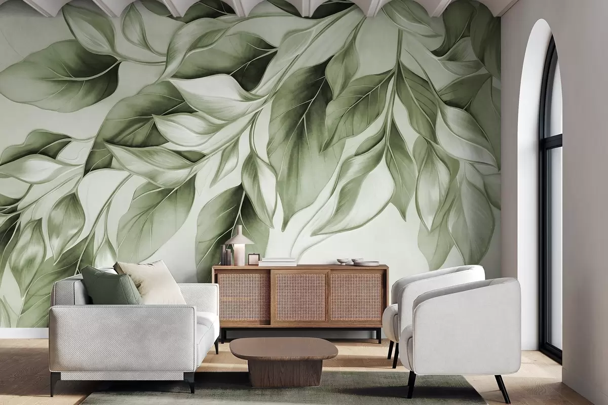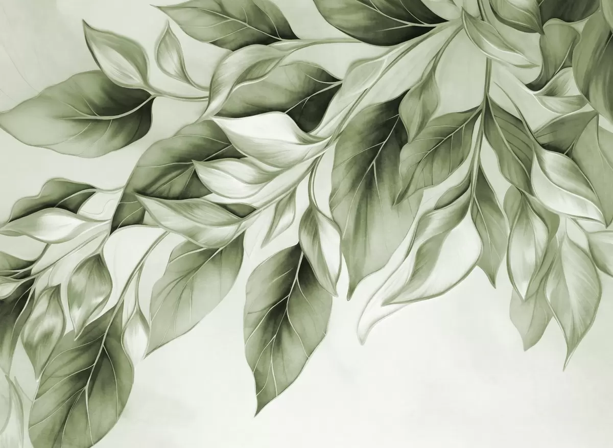 Papel tapiz Hojas verdes apagadas con textura, fondo claro, diseño elegante y artístico, estilo moderno. Nr. w09429v1