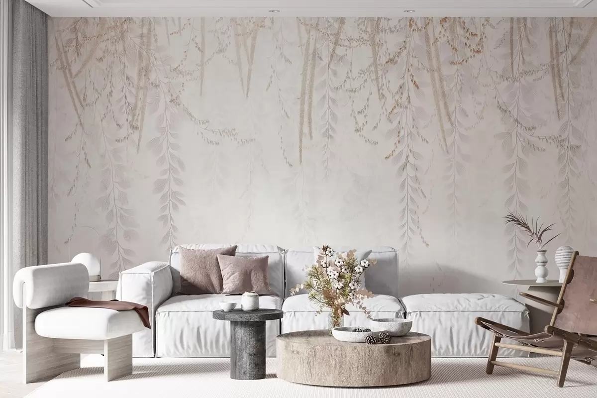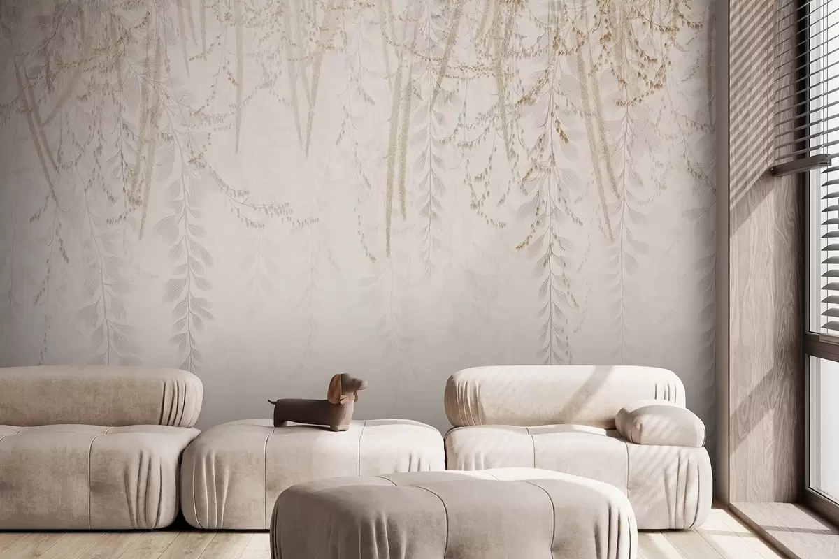 Papel tapiz Hojas y ramas ligeras colgantes en tonos beige Nr. w09433