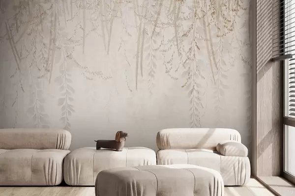 Papel tapiz Hojas y ramas ligeras colgantes en tonos beige Nr. w09433