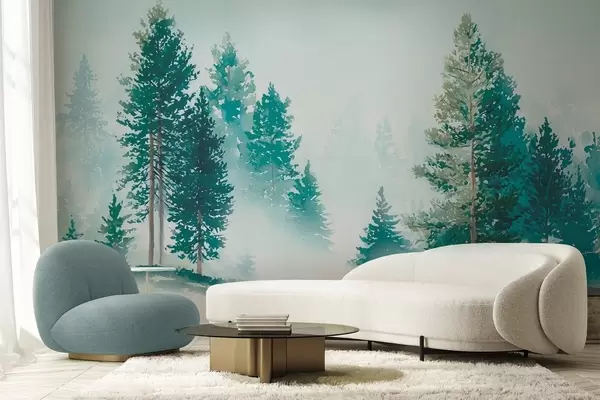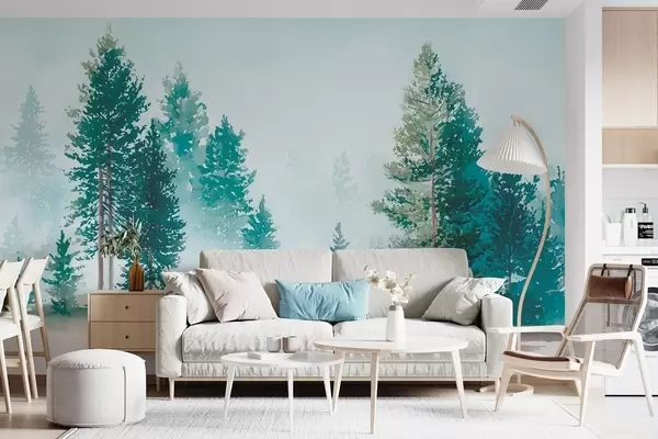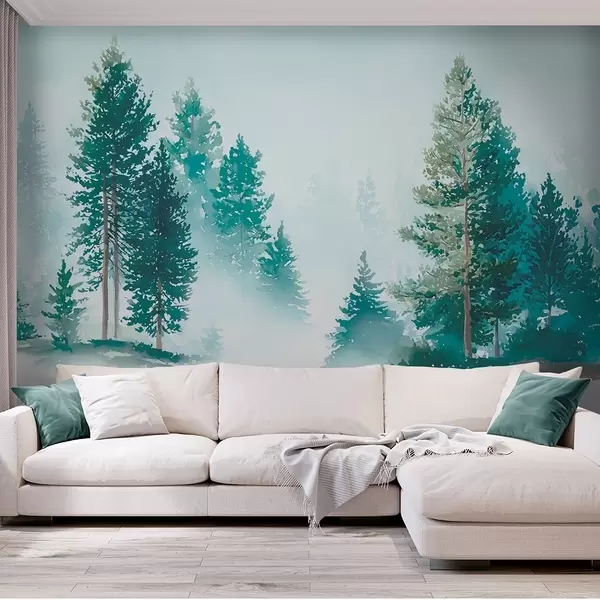 murales de pared Bosque de pinos brumoso en estilo acuarela w09444