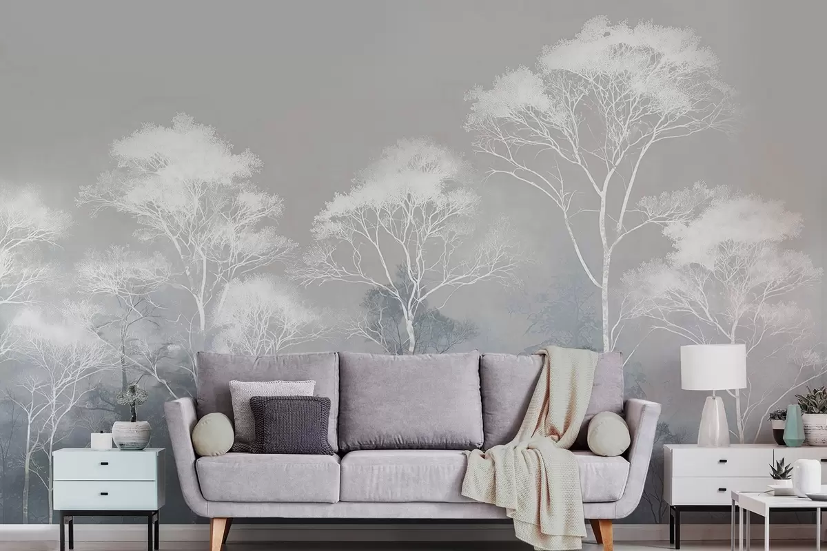 Papel tapiz Árboles minimalistas en tonos azul grisáceos, en la niebla Nr. w09448