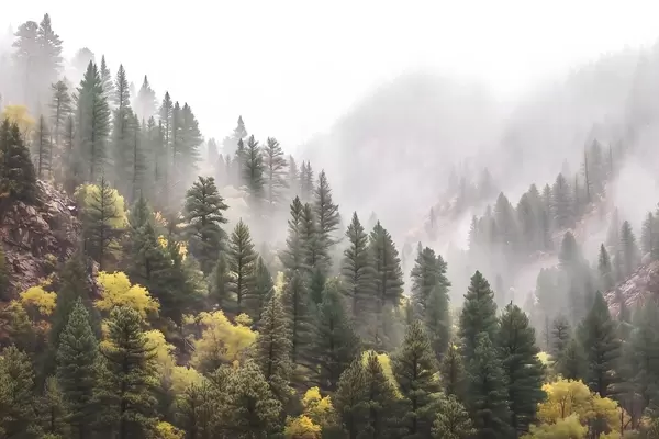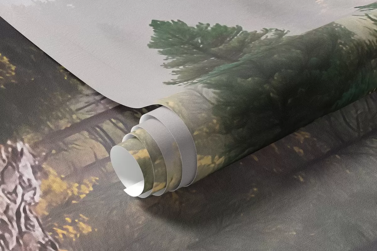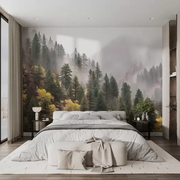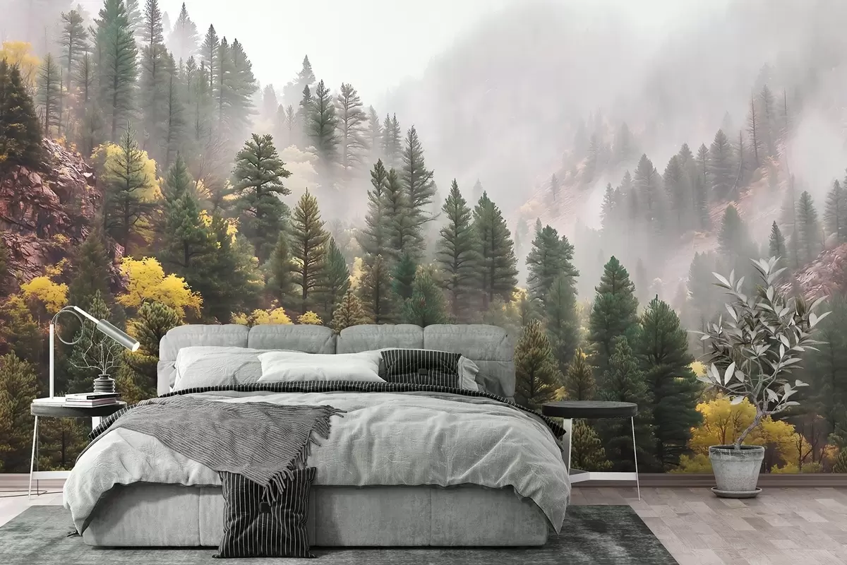 Papel tapiz Bosque de pinos brumoso y evocador en las montañas Nr. w09463