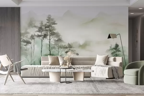 Papel tapiz Paisaje brumoso con árboles altos y montañas en tonos verdes y grises apagados, estilo minimalista, texturizado Nr. w09469
