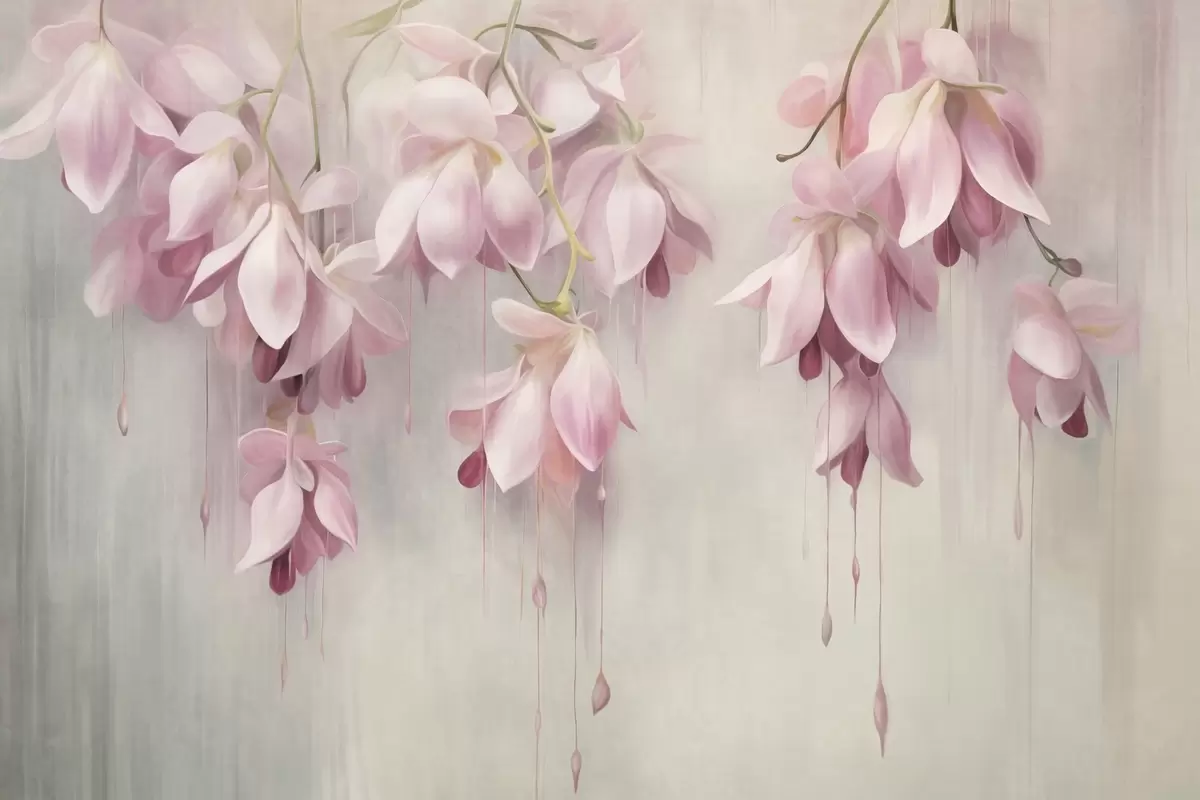 Papel tapiz Flores rosas colgantes, fondo gris claro, arreglo floral con textura, arte botánico, colores pastel Nr. w09471