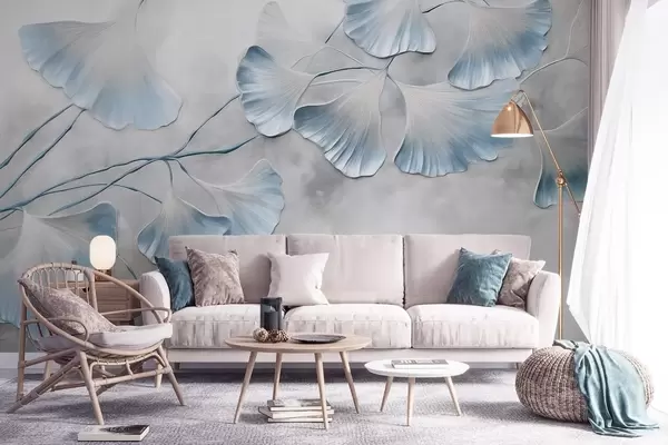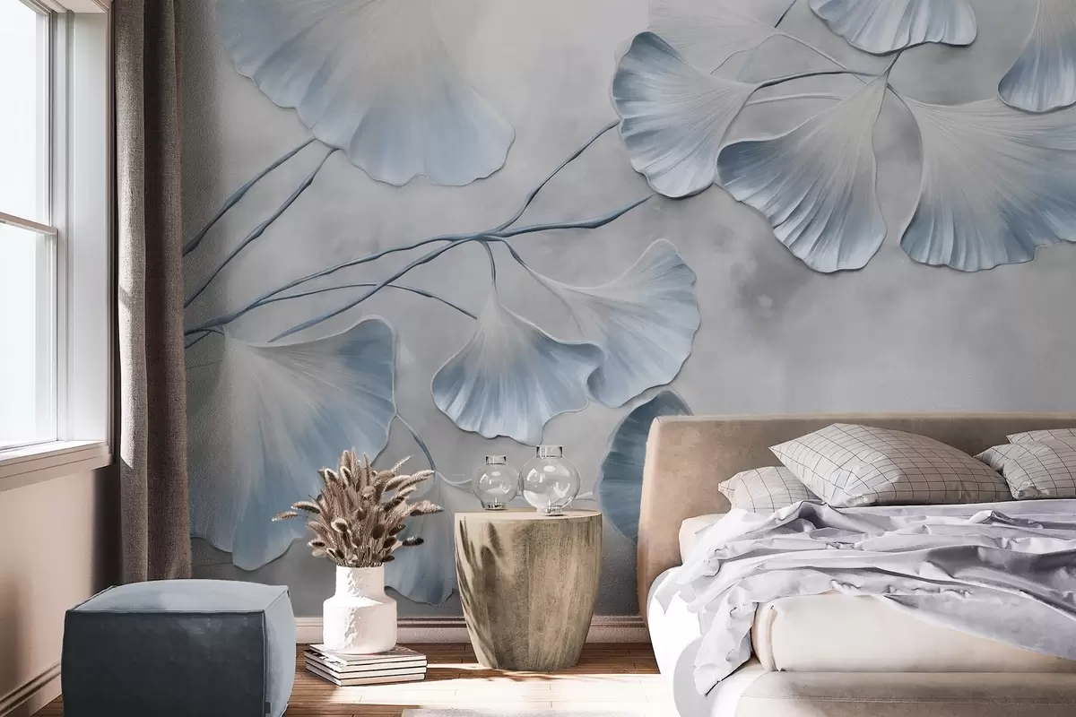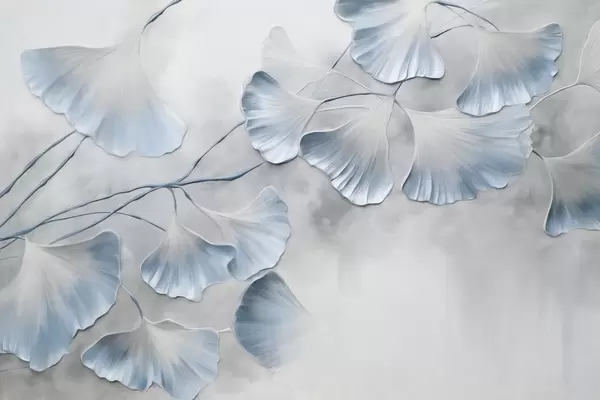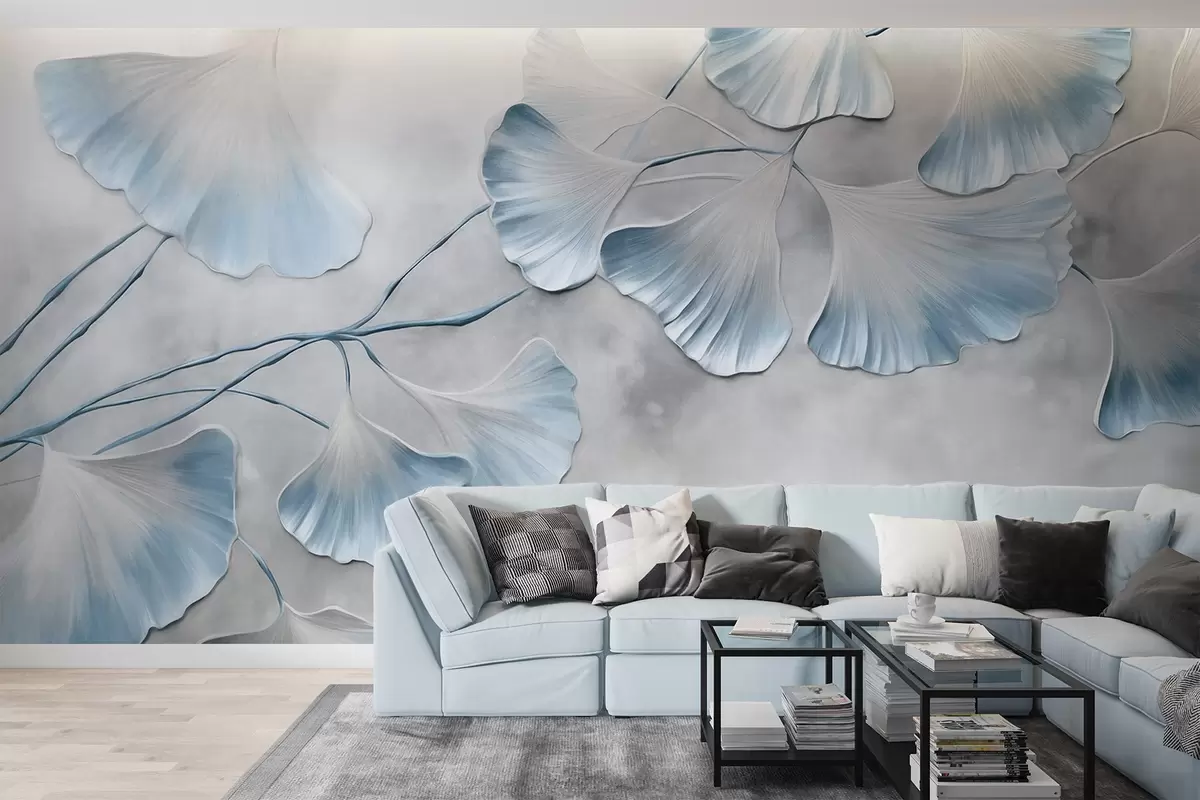 Papel tapiz Hojas de ginkgo biloba con bordes azules en una rama, fondo gris texturizado, diseño elegante y minimalista Nr. w09472v1