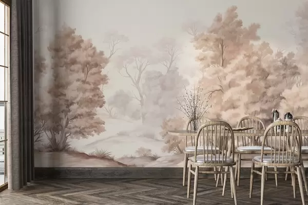 Papel tapiz Pintura paisajística texturizada que imita un bosque con árboles altos y hierba, colores apagados y suaves, escena relajante Nr. w09474