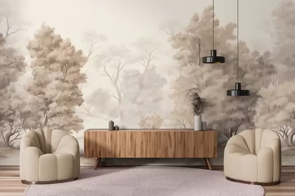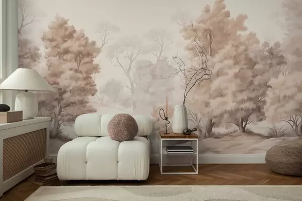 Papel tapiz Pintura paisajística texturizada que imita un bosque con árboles altos y hierba, colores apagados y suaves, escena relajante Nr. w09474