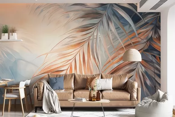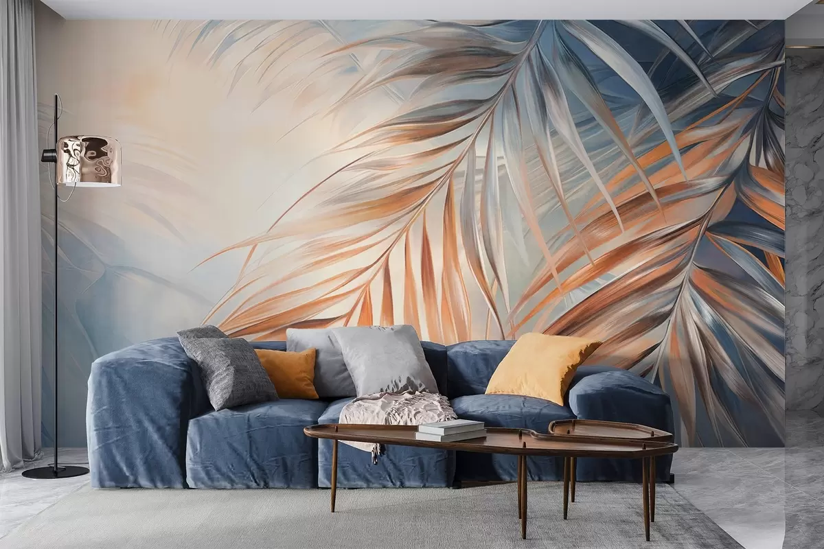 Papel tapiz Hojas de palmera con tonos naranjas y azules, fondo con textura ligera y colores suaves, elegante estilo tropical Nr. w09475