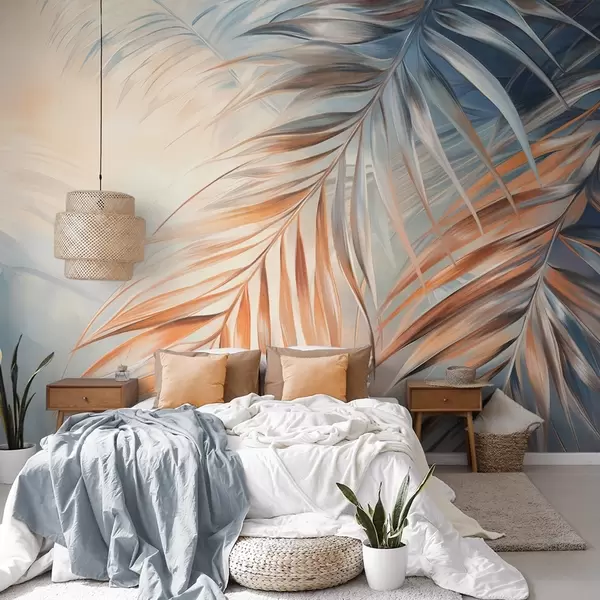 Papel tapiz Hojas de palmera con tonos naranjas y azules, fondo con textura ligera y colores suaves, elegante estilo tropical Nr. w09475