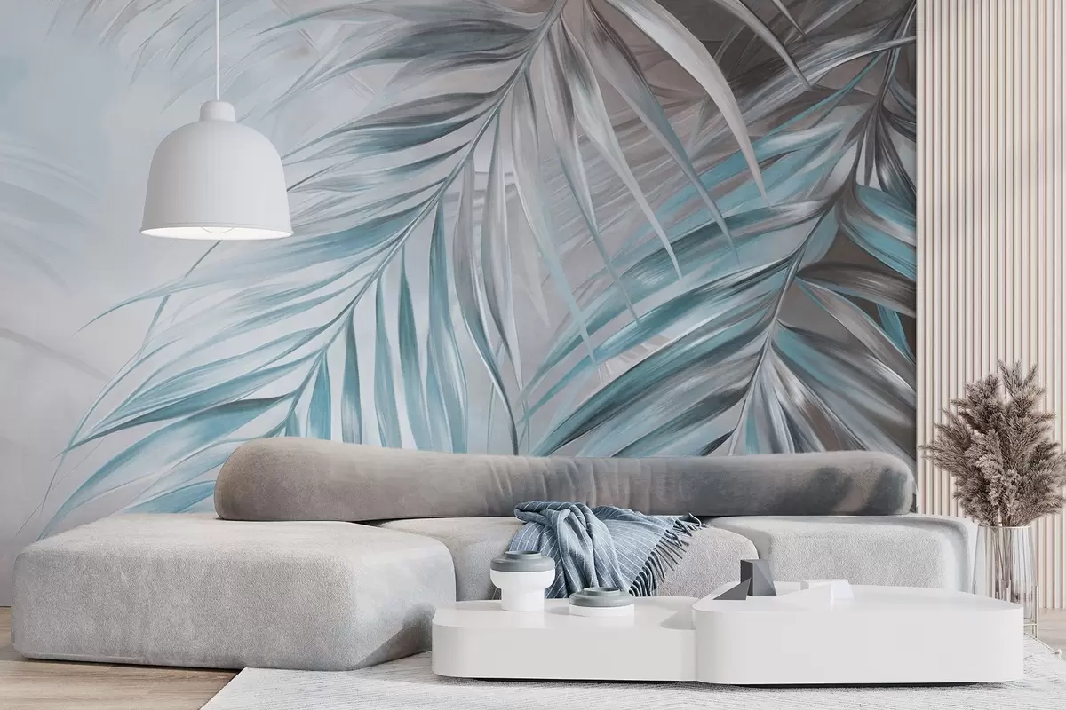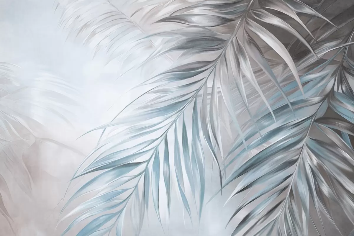 Papel tapiz Hojas de palmera con tonos grises y azules, fondo con textura ligera y colores suaves, elegante estilo tropical Nr. w09475v1