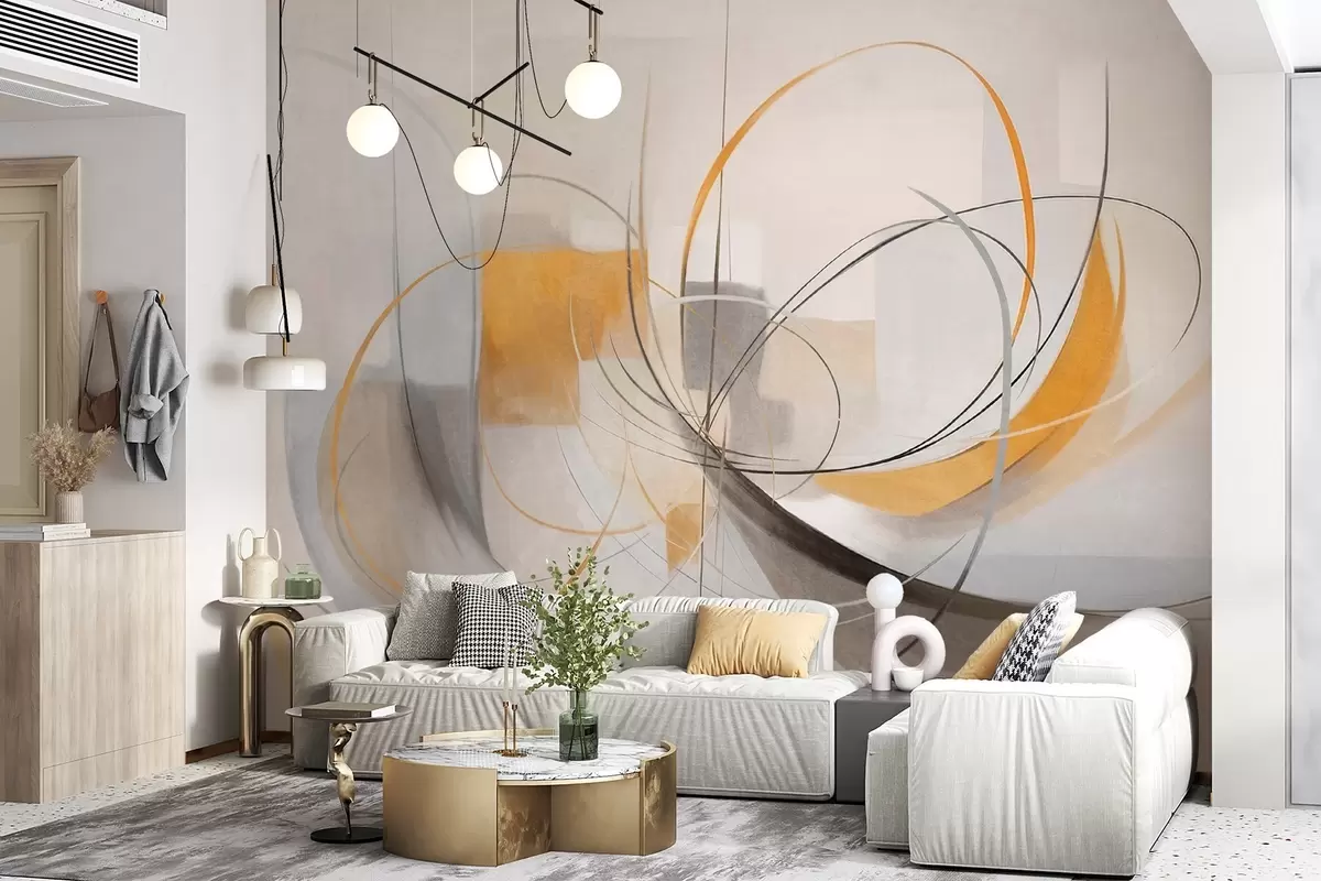Papel tapiz Estilo pictórico moderno abstracto con texturas, líneas curvas y formas geométricas en tonos grises, blancos y naranjas Nr. w09476