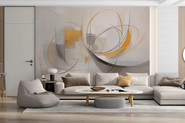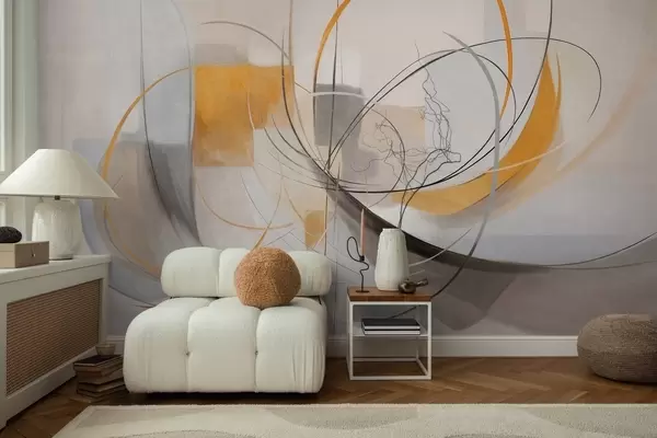 Papel tapiz Estilo pictórico moderno abstracto con texturas, líneas curvas y formas geométricas en tonos grises, blancos y naranjas Nr. w09476